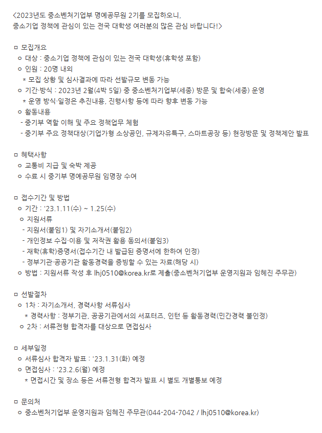 <2023년도 중소벤처기업부 명예공무원 2기를 모집하오니,