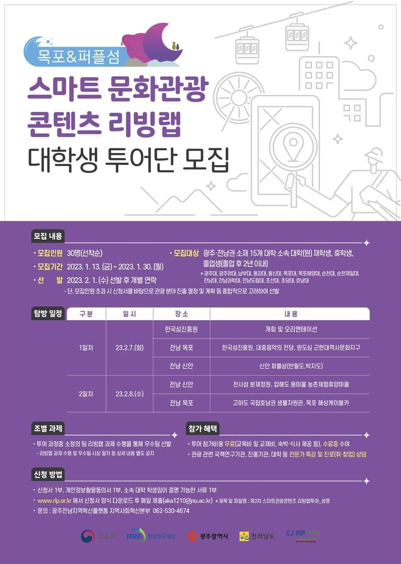 주제 스마트 문화관광 콘텐츠 리빙랩 대학생 투어단 모집 기간 및 일정 - 행사일시 :2023.2.7(화) 10:30\~2.8(수) 17:00 - 모집 및 선발 :2023.1.13(금)\~1.30(월) 참가대상 - 광주전남지역 15개 대학(원)생 재학생, 휴학생, 졸업생(졸업후 2년이내) - 15개 대학 해당 여부는 공고문 참조 참가혜택 투어 참가비용 무료(교육비 및 교재비, 숙박·식사 제공 등) 수료증 수여 관광 관련 국책연구기관, 진흥기관, 대학 등 전문가 특강 및 진로(취·창업) 상담 활동내용 *관광 관련 리빙랩 투어 참여, 조별 과제 기타 지원요령, 선발 등 자세한 내용은 포스터와 아래 사이트를 참조해 주시기 바랍니다.. https://rip.or.kr/ ※ 본 공모전 내용은 주최사 사정으로 변경될 수 있습니다. 반드시 주최사 공모요강을 확인하시기 바랍니다. #관광#여행#투어#문화#로컬#역사#지역#섬#퍼플섬#해상케이블카#리빙랩#콘텐츠#커뮤니티#스마트#플랫폼#대외활동
