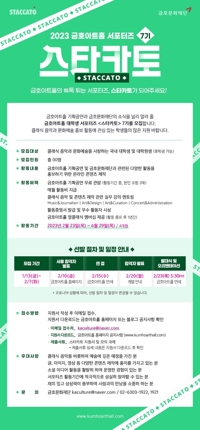[금호문화재단] 금호아트홀 서포터즈 <스타카토> 7기 모집! (\~2/7)