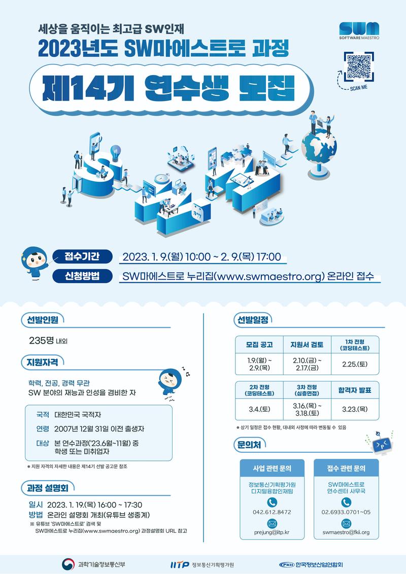 📢 2023년도 SW마에스트로 과정 제14기 연수생 모집 SW산업을 선도할 최고급 SW인재 양성, SW마에스트로 제14기 연수생을 모집합니다 ! ✅ 접수 기간 : 2023. 1. 9.(월)\, 10:00 ∼ 2. 9.(목)\, 17:00 ✅ 모집 인원 : 235명 내외 ✅ 지원 자격 - 본 연수과정(2023년 6월\~11월) 중 학생 또는 미취업자로서 학력\, 전공\, 경력 무관하나 SW 분야의 재능과 인성을 겸비한 자 ✅ 응시원서 접수 방법 https://swmaestro.org/sw/main/contents.do?menuNo=200033 * 자세한 사항은 SW마에스트로 누리집(www.swmaestro.org)을을) 통해 확인하세요! ✅ 문의처 : SW마에스트로 연수센터 사무국 - 사업문의 : 정보통신기획평가원 사업담당자 ( prejung@iitp.kr, 042-612-8472) - 접수문의 : SW마에스트로연수센터 사무국 ( swmaestro@fkii.org, 02-6933-0701∼5) 🔻🔻🔻🔻🔻🔻🔻🔻🔻주목!!🔻🔻🔻🔻🔻🔻🔻🔻🔻