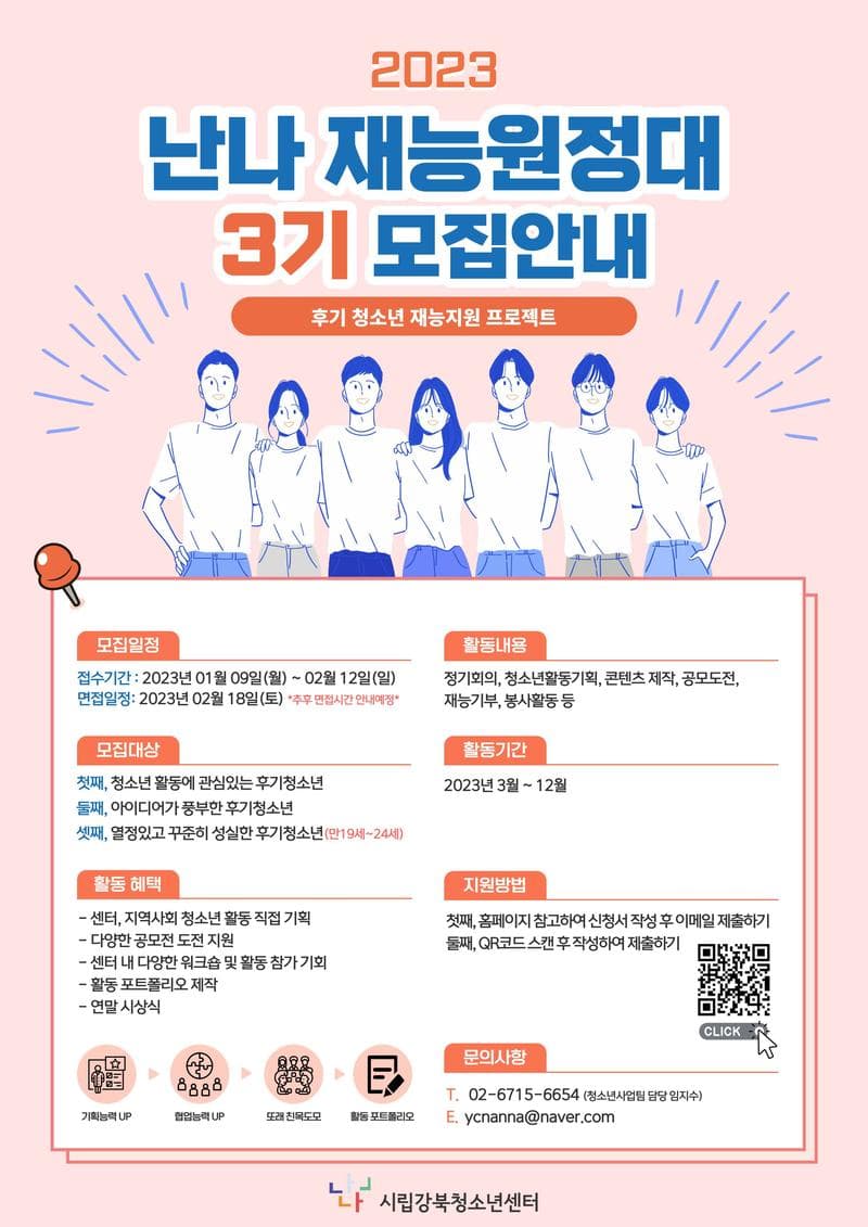 🎉청소년활동에 관심 갖고 나의 재능을 발휘하고 싶은 만 19세\~24세 청소년!!! 모집합니다.🎉 📌 활동내용 : 창소년활동기획, 재능기부&봉사, 관심사 컨텐츠 제작, 공모도전 모든 활동을 자유롭게 📌 참가혜택 : 봉사시간(관련 봉사에 참여할 경우), 실무경험, 위촉장, 활동우수자 표창 📌 신청방법 : 구글 신청서를 통한 지원서 작성! https://forms.gle/C6rpFyrtYqM28Joz5 📌 문의 : nannayc@naver.com / 02-6715-6654(청소년사업팀)