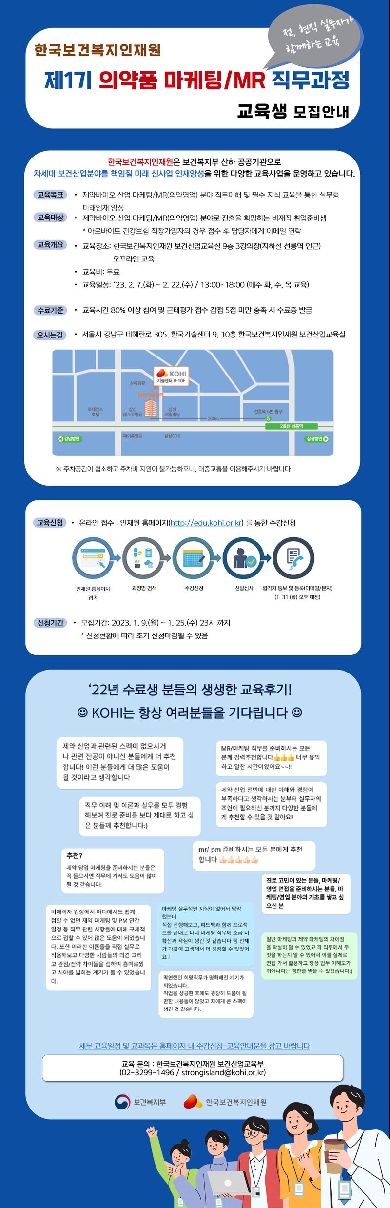 안녕하세요, 한국보건복지인재원입니다. 겨울방학 및 23학년도 상반기 졸업시즌을 맞이하여 전/현직 실무자와 함꼐하는 제약바이오 마케팅/MR 교육과정을 개설하였으니, 많은 관심 부탁드립니다 :)