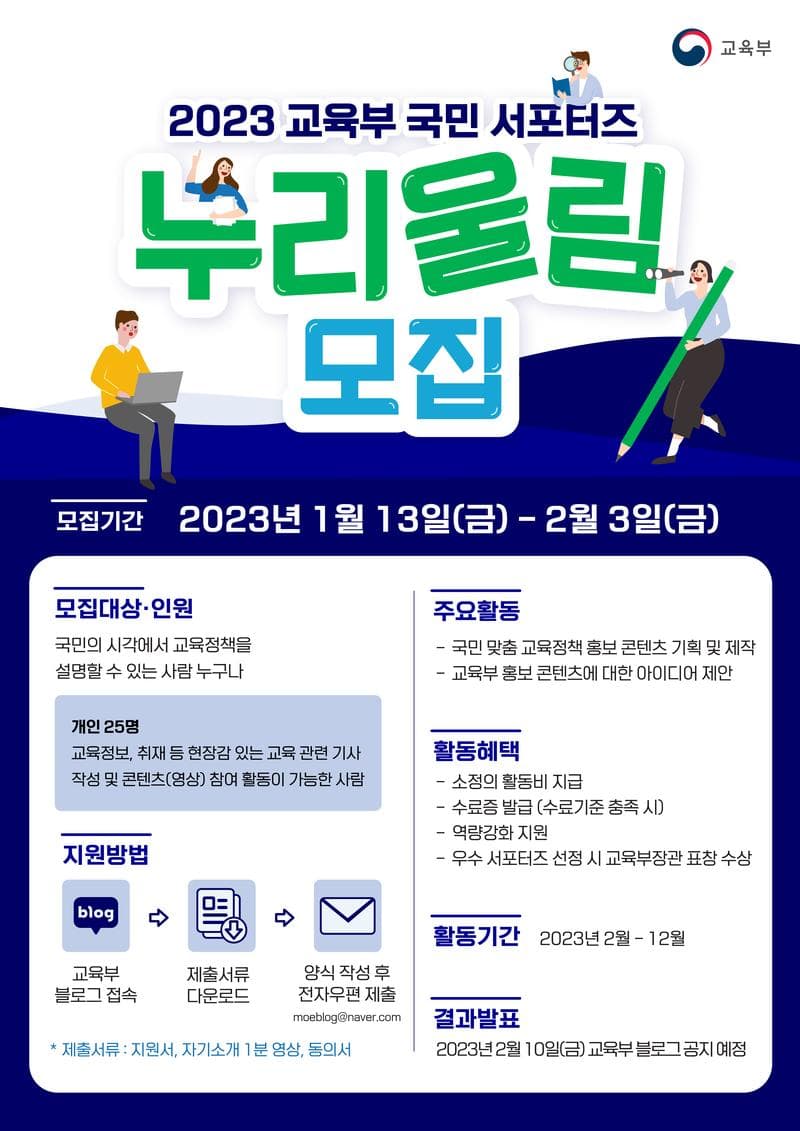 교육정책과 교육정보를 발 빠르게 전달하고, 국민의 시선에서 교육분야 홍보가 될 수 있도록 교육부와 함께하는 서포터즈 누리울림 모집이 시작됩니다.