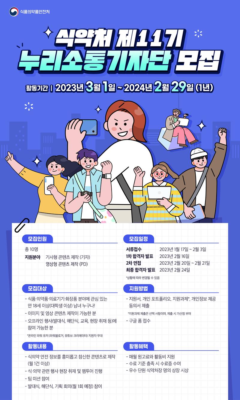 안녕하세요! 2023년 식약처와 함께 누리소통망(SNS)으로 식의약 안전정보를 전해 줄 '제11기 누리소통 기자단'을 모집합니다!