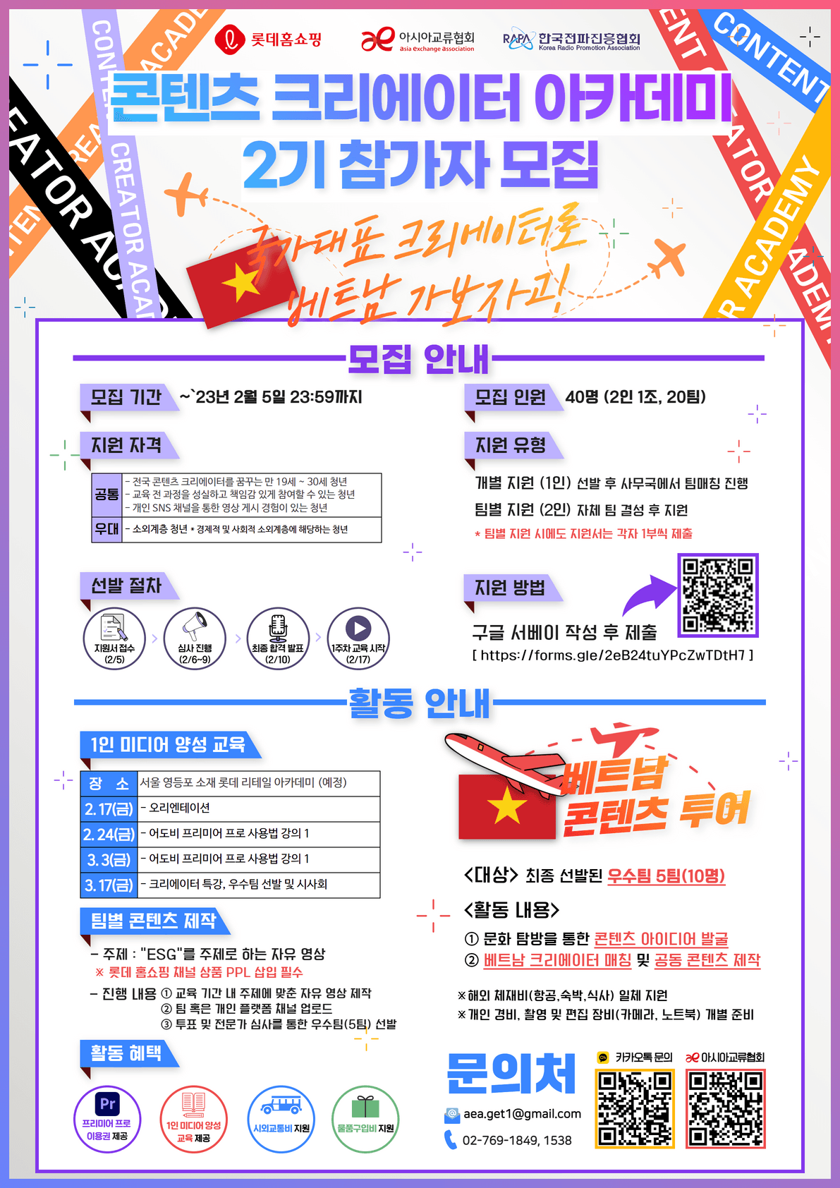 「콘텐츠 크리에이터 아카데미」는 콘텐츠 창작자를 꿈꾸는 국내 청년들에게 ▲국내 1인 미디어 양성교육과 ▲베트남 파견 및 현지 크리에이터와의 협업 기회 제공을 통해 미래 방송 산업을 이끌어갈 글로벌 미디어 인재를 육성하는 전문 콘텐츠 크리에이터 양성교육 프로그램입니다. 장차 글로벌 콘텐츠 세계를 이끌어 갈 역량 있는 참가자를 아래와 같이 모집하오니 많은 관심과 지원 바랍니다. :)