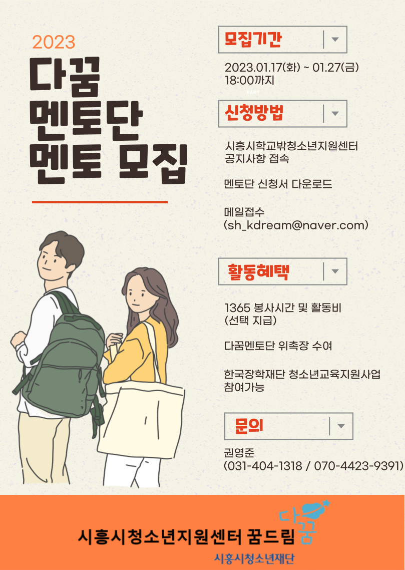 2023 다꿈멘토단 모집 ※ 학교밖청소년의 학습지원을 위한 멘토를 모집합니다. ※ - 모집일정 : 2022년 1월 17일(화) \~ 1월 27일(금) 18:00까지 / 면접일정 : 추후공지 - 모집대상 1) 학습멘토 : 학교밖청소년의 기초학습지원이 가능하신 분 - 활동내용 : 주 1회 1:1 멘토링 진행 및 정기모임, 필수교육 참여 등 - 활동혜택 2) 1365 봉사시간 또는 소정의 활동비 지급 3) 한국장학재단 청소년교육지원 장학금사업 참여 가능 4) 위촉장 수여 등 - 지원방법 1) 시흥시 학교밖청소년지원센터 홈페이지 접속 후 공지사항 게시판 열람 2) 다꿈멘토단 신청서 다운로드 3) 작성 후 메일 접수(sh_kdream@naver.com)