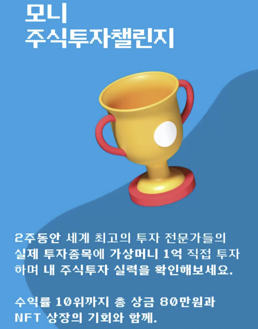 전설적인 투자자들은 어떻게 투자했을까? 1억 가상머니로 8인의 레전드들의 투자종목에 투자하며 주식의 기초를 배우고, 푸짐한 상금과 함께 증명서 발급, 그리고 모니랩이 직접 발행한 NFT 상장 수여의 기회를!