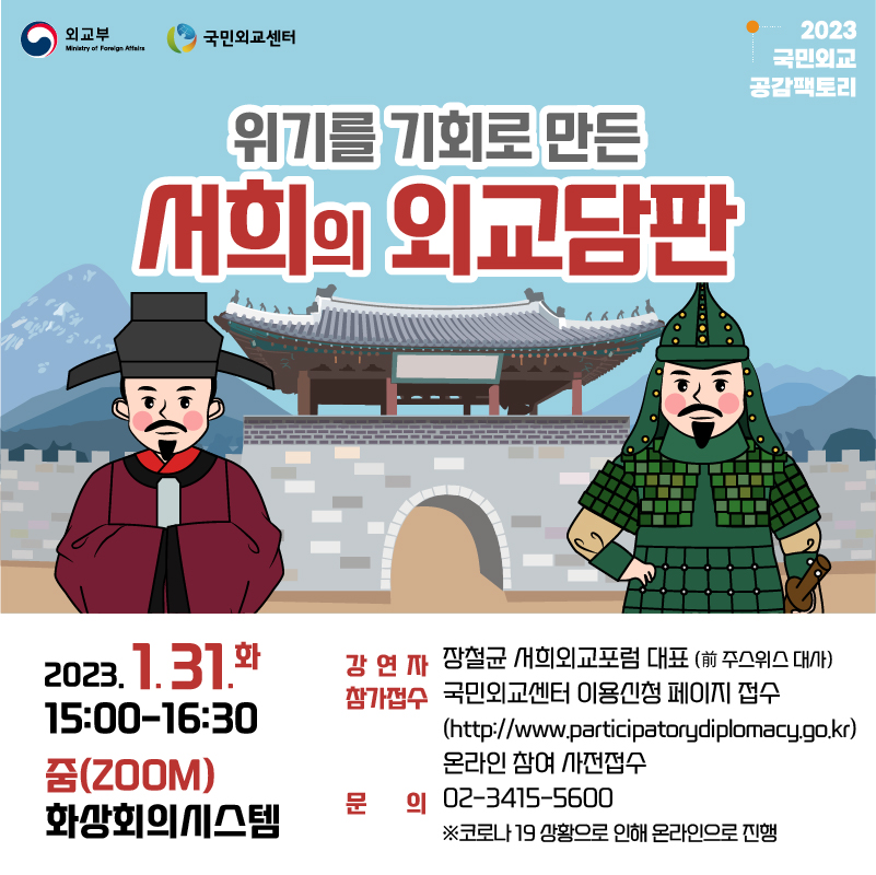 외교부는 1월 31일(화) 15:00-16:30 “위기를 기회로 만든 서희의 외교담판" 을 주제로 국민외교 공감팩토리를 개최할 예정입니다.