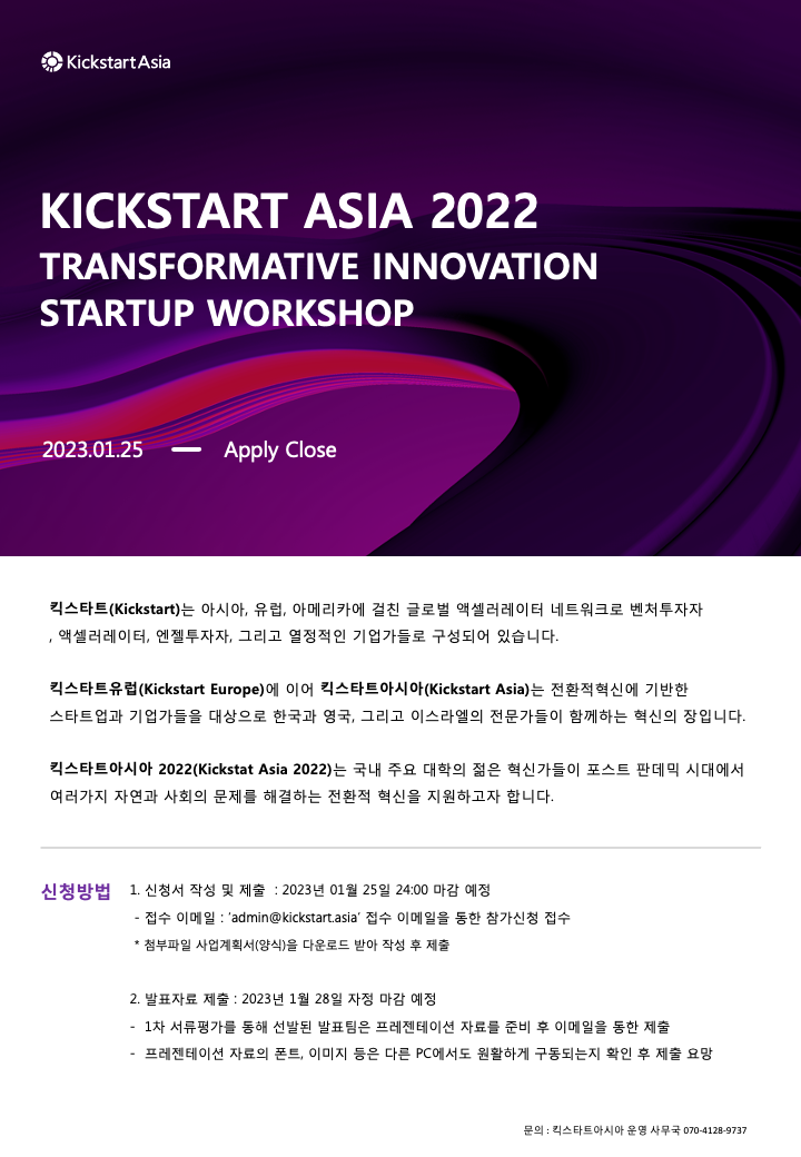 킥스타트유럽(Kickstart Europe)에 이어 킥스타트아시아(Kickstart Asia)는 전환적혁신에 기반한 스타트업과 기업가들을 대상으로 한국과 영국, 그리고 이스라엘의 전문가들이 함께하는 혁신의 장입니다. 전환적혁신이란 공학과 상업의 근본적인 목적을 표면적인 이익을 넘어서 자연과 사회의 다양한 문제 및 위험들을 해결하고자 하는 선한 의지에 기반한 혁신 활동을 의미합니다. 킥스타트아시아 워크샵은 지난 10여 년 간 선한 의지를 갖고 있는 스타트업과 전문가들이 서로 협력하는 생태계를 만들기 위해 노력해 왔습니다. 킥스타트아시아 2022(Kickstat Asia 2022)는 국내 주요 대학의 젊은 혁신가들이 포스트 판데믹 시대에서 여러가지 자연과 사회의 문제를 해결하는 전환적 혁신을 지원하고자 합니다. ○ Itinerary - 접수 일정 : 01월 01일 일요일 \~ 01월 25일 수요일 24:00 - 등록 일정 : 01월 28일 토요일 18:00 - 행사 일정 : 01월 31일 화요일 18:00 \~ 20:00 ○ Schedule - 세션 1. 키노트 스피치 - 세션 2. 패널 스피치 - 세션 3. 비즈니스 피치 - 세션 4. 비즈니스 네트워킹 ○ Applicant - 전환적혁신 및 지속가능 목표 등 선한 의지를 목적으로 하는 기업가 - 현재 대학의 재학중인 다양한 사회 문제를 해결하고자 하는 운동가 및 혁신가 ○ Benefits. - 상금 100만원, 한국 최고의 창업 전문가 네트워킹 및 피드백 - 상위 수상팀 킥스타트아시아 멘토단 자문 ○ Apply. - 신청서 작성 및 제출 : 2023년 01월 25일 24:00 마감 예정 • 아래 링크를 통해 첨부된 사업계획서(양식)을 다운로드 받아 작성 후 이메일을 통한 접수 • 킥스타트아시아 2022 지원서
