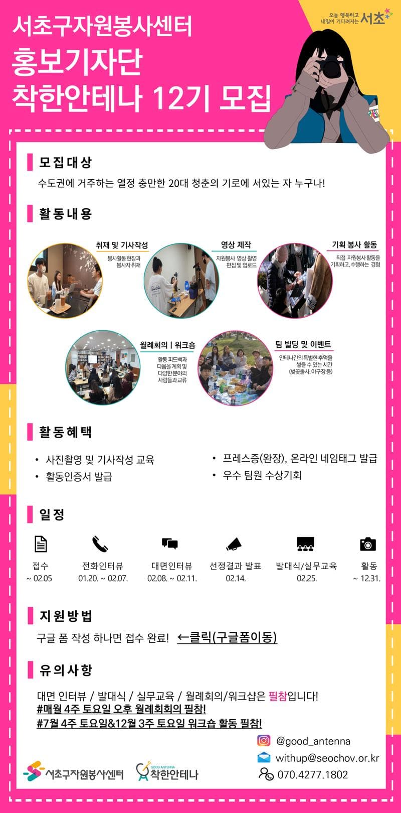 서초구자원봉사센터에서는 센터의 소식을 알리고 서초구의 착한 소식을 전하는 홍보기자단 착한안테나 12기를 모집합니다!