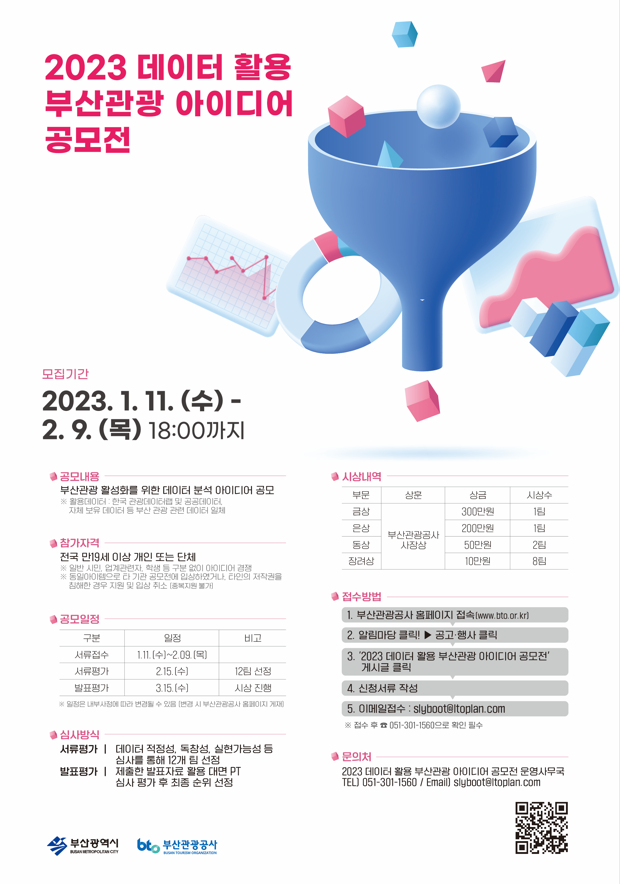 □ 접수방법 1. 부산관광공사 홈페이지 접속(www.bto.or.kr) 2. 알림마당 클릭 > 공고·행사 클릭 3. ‘2023 데이터 활용 부산관광 아이디어 공모전’ 게시글 클릭 4. 신청서류 작성 5. 이메일접수 : slyboot@ltoplan.com(접수후, 051-301-1560 확인 필수)