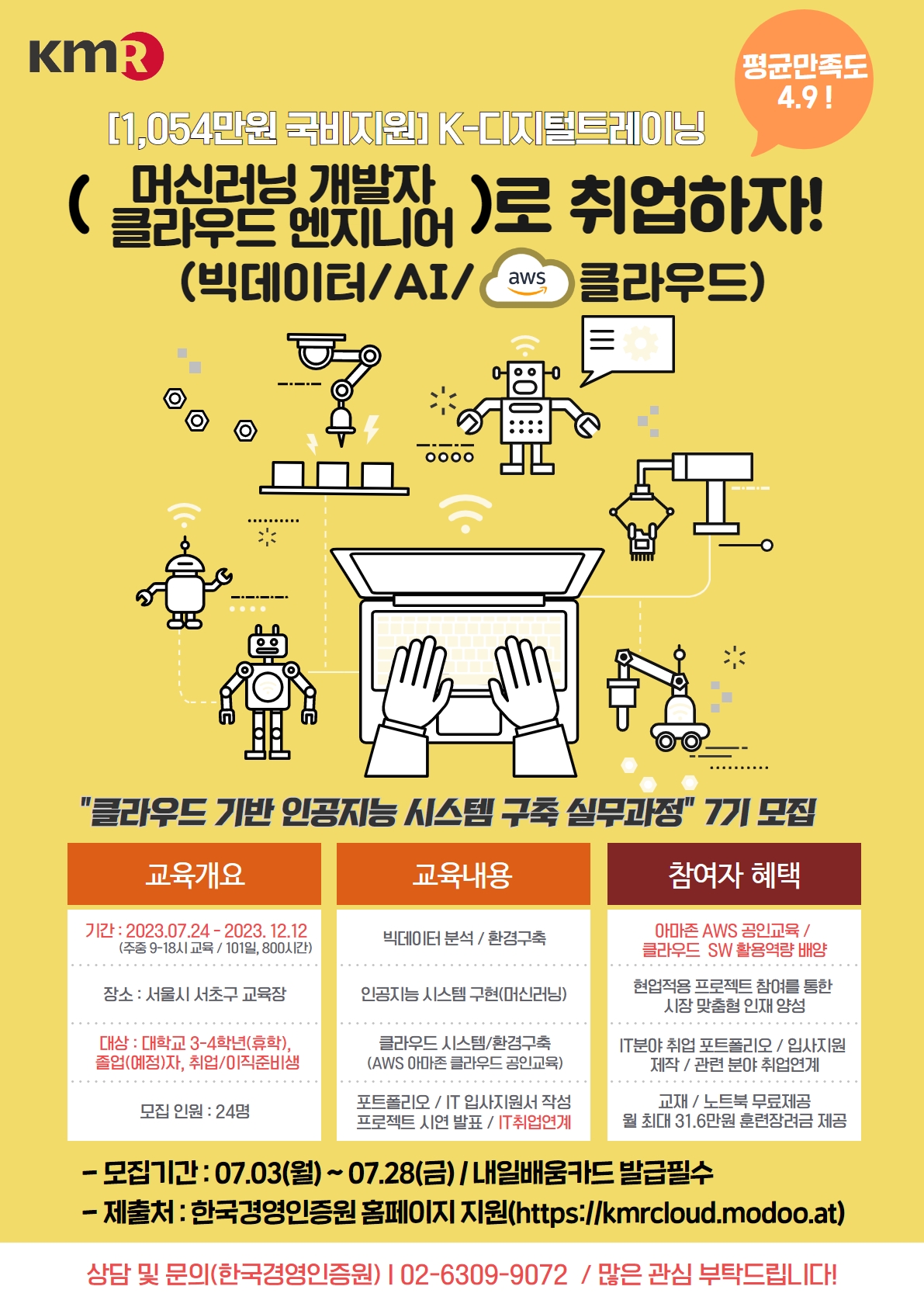 [교육개요] 1. 교육명 : 클라우드 기반 인공지능 시스템 구축실무과정 7기 2. 교육대상 : IT/SW 개발자 취업을 희망하는 대학교 3\~4학년\, 졸업(예정)자\, 취업/이직준비생 등 / 정원 24명 3. 교육기간 : 2023년 07월 24일(월) \~ 2023년 12월 12일(화) / 101일 800시간 / 09\~18시\, 1일 8시간 4. 교육장소 : 서울시 서초구 동작대로 132, 안석빌딩 9층 904호 5. 교육비 : 전액 무료(국고지원) / 1인 교육비용 1,054만원 상당(내일배움카드 발급 필수) 6. 모집기간 : 고용노동부 전산 등록으로 인한 마감기한 엄수 - 7기 : 2023년 07월 03일(월)\~ 2023년 07월 28일(금) ※ 국민내일배움카드 발급이 2주가 걸리므로 반드시 교육시작 최소 2주전 신청요망 7. 참여자 혜택 ① 수업의 50% 이상을 반영하여 현업에 적용할 프로젝트 활동 실시 ⇒ 기업/시장분석, 역량강화 ② 현직 SW 기술전문가의 프로젝트 참여 멘토링 진행 ③ 본 프로그램 수료생 대상 채용 우대 기업으로의 연계지원 ④ 취업을 위한 진로/취업상담 멘토링 제공 ⑤ 매월 훈련장려금 최대 31.6만원 지급