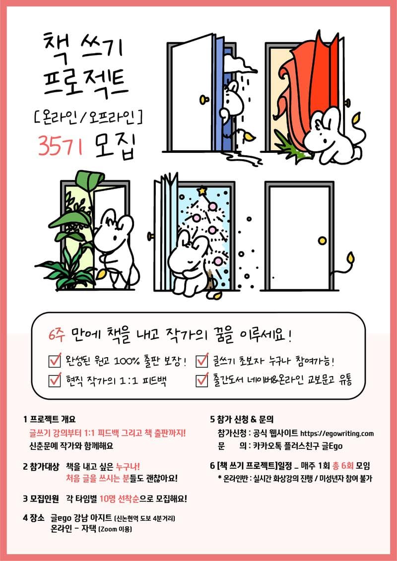 6주 만에 책을 쓰고 작가의 꿈을 이루는 책 쓰기 프로젝트 35기를 추가 모집합니다.