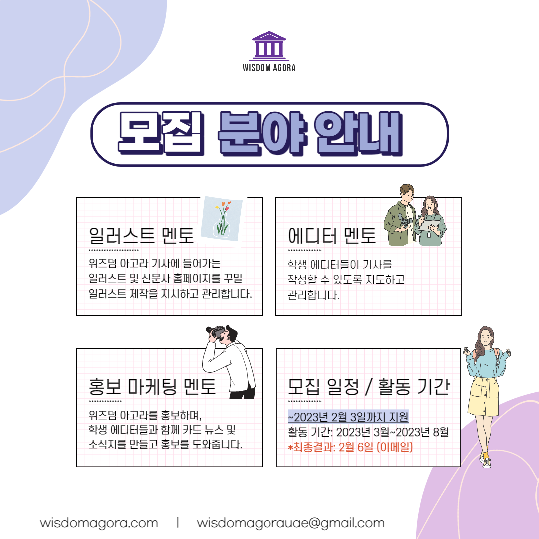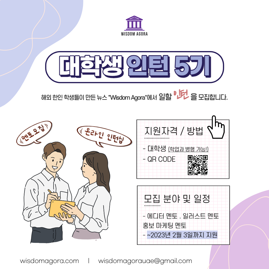 Wisdom Agora는 해외에서 국제 학교를 졸업하고 대학생이 된 학생들이 만든 온라인 신문사로 한인 고등학생들이 만든 기사, 일러스트, 미디어를 통해 함께 생각을 나누는 공간입니다.