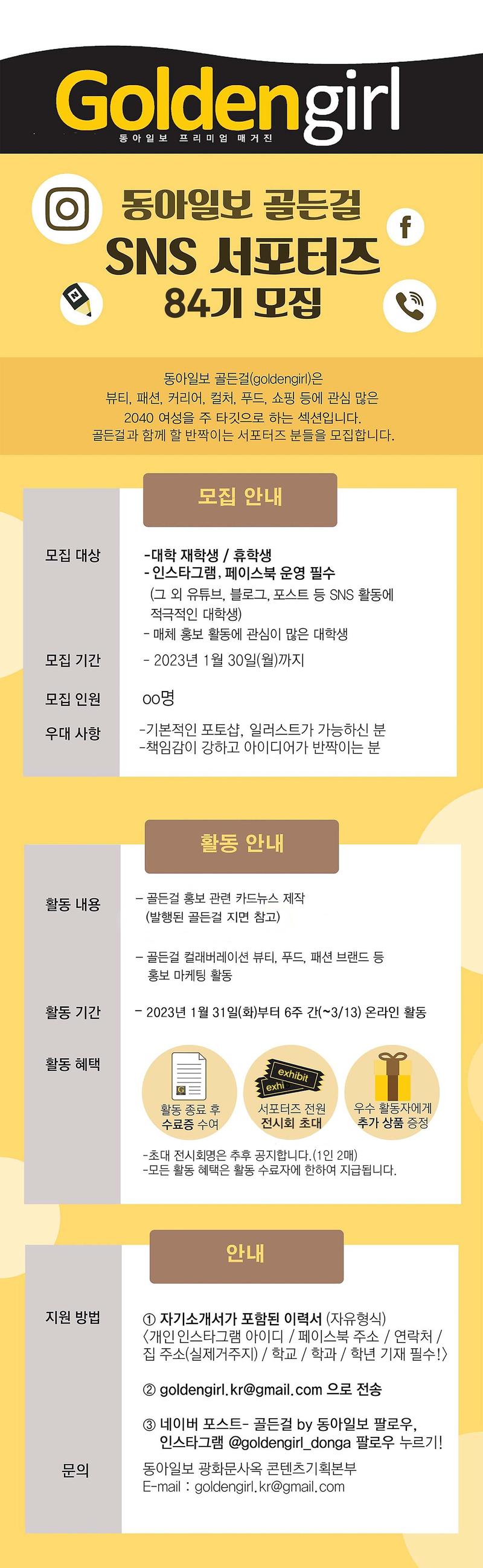#골든걸서포터즈 동아일보 프리미엄 섹션 '골든걸' 에서 대학생 서포터즈 '84기' 를 모집합니다. 동아일보 골든걸 인스타그램, 페이스북, 포스트 홍보 & 컨텐츠 제작 등 동아일보 골든걸 함께 다양한 경험을 하고자 하는 대학생들은 여기 *주목*해주세요\~! 대학생이면 누구나 참여 가능하며, 휴학생도 지원할 수 있습니다. _ 먼저, 1. 동아일보 골든걸 공식 인스타그램\, '동아일보 골든걸(@goldengirl_donga)' 을 검색해 '팔로우' 를 누르시고, 2. 동아일보 골든걸 공식 네이버 포스트\, '골든걸 by 동아일보' 을 검색해 '+팔로우' 를 누르신 후, 골든걸 서포터즈를 지원해주세요!