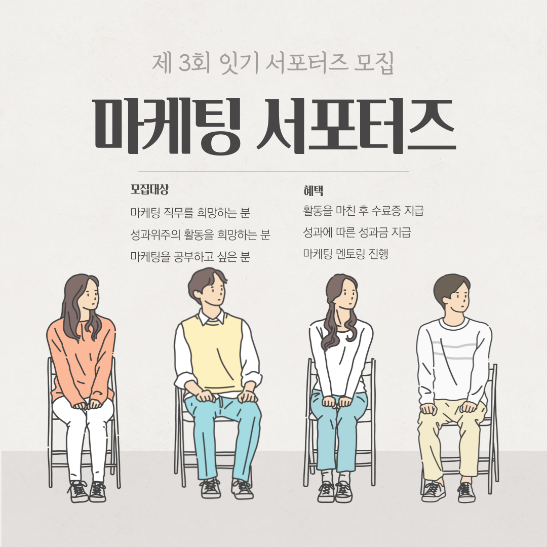 안녕하세요, 여러분 :) 잇기를 운영하는 송사장입니다. [잇기]는 현재 IT PM/PO직 및 기획교육을 진행하고 있습니다. . 서포터즈 여러분들과 함께 잇기를 마케팅하고자 합니다. 그 어떤 대외활동 보다도 가장 보람차고 의미가 있는 활동을 남겨드리겠습니다! 잇기와 [진짜 마케팅]을 함께 해보실 분들을 구합니다. . * 잇기 서포터즈만의 특징 * 1. 여러분들의 의견이 많이 반영되는 활동이 될 것 입니다. 2. 마케팅 멘토링이 함께 진행됩니다. 3. 결과가 좋다면 그에 따른 보상도 주어집니다. 4. 마케팅 이론과 실전을 함께 해보는 활동이 이뤄집니다. 5. 모든 활동은 온라인으로 진행됩니다. . * 이런분들 신청해 주시면 좋아요 * 1. 마케팅 직군을 꿈꾸며 경험해 보고 싶으신 분 2. 온&오프라인 마케팅 활동에 열려 있으신 분 3. SNS활동이 활발하신 분 4. 서포터즈 팀활동에 있어 시간적 여유가 있으신 분 . * 모집인원 * 1. 총 40명 . * 일정 * 1. 모집기간 : 01/23 \~ 02/01 2. 발표일자 : 02/02 3. 오리엔테이션 : 02/03 오후 1:00 4. 활동기간 : 02/03 \~ 03/03 . * 이런 활동을 합니다 * 1. 잇기 브랜드 마케팅 활동 2. 마케팅 콘텐츠 제작활동 3. 관심사가 맞는 동료들과 팀 활동 4. 실무와 유사한 회의 및 KPI . * 혜택 * 1. 서포터즈 활동 수료증 지급 2. 팀단위 프로젝트 경험 3. 성과에 따른 인센티브 지급 4. 실무와 유사한 시스템 경험 . * 신청링크 * 신청 및 상세안내 : https://forms.gle/2GAtaEVeGA88oxgx5 . * 주의사항 * 잇기 서포터즈는 상품 또는 활동비를 지급하지 않습니다. 마케팅의 지식과 경험 그리고 성과에 따른 보상을 드립니다.