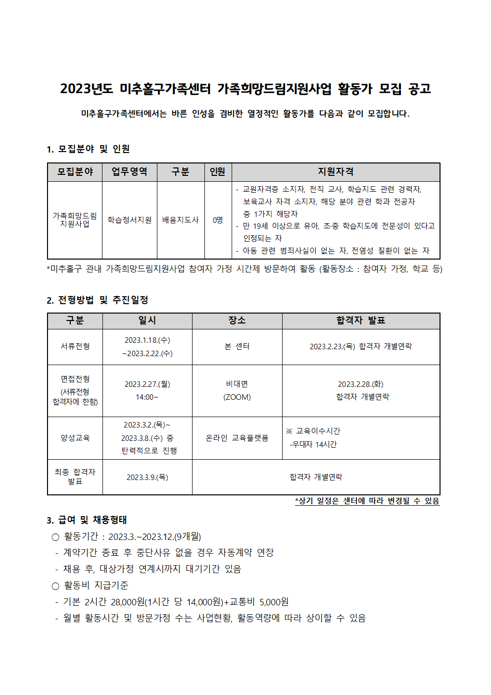 3. 전형방법 및 추진일정 1) 서류전형 : 2023. 1. 18.(수)\~2. 22.(수) / 2023. 2. 23.(목)_합격자 개별연락 - 첨부파일 참고(응시서류 작성하여 메일 접수_ michu19@naver.com) 2) 면접전형 : 2023. 2. 27.(월) 14:00\~ / 비대면 진행_합격자 개별연락 3) 양성교육(필수) - 2023. 3. 2.(목)\~3. 8.(수)(조정가능) 온라인 교육플랫폼을 통해 탄력적으로 수강 - 총 28시간(우대자 14시간)
