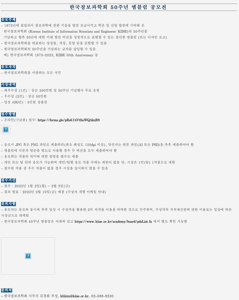 유의사항 - 응모자는 응모와 동시에 추후 입상 시 수상작을 활용한 2차 저작물 이용을 허락한 것으로 간주하며\, 수상작의 저작재산권에 대한 이용료는 입상에 따른 시상금으로 대체됨 - 한국정보과학회 40주년 엠블럼은 https://www.kiise.or.kr/academy/board/pdsList.fa 에서 별도 확인 가능함