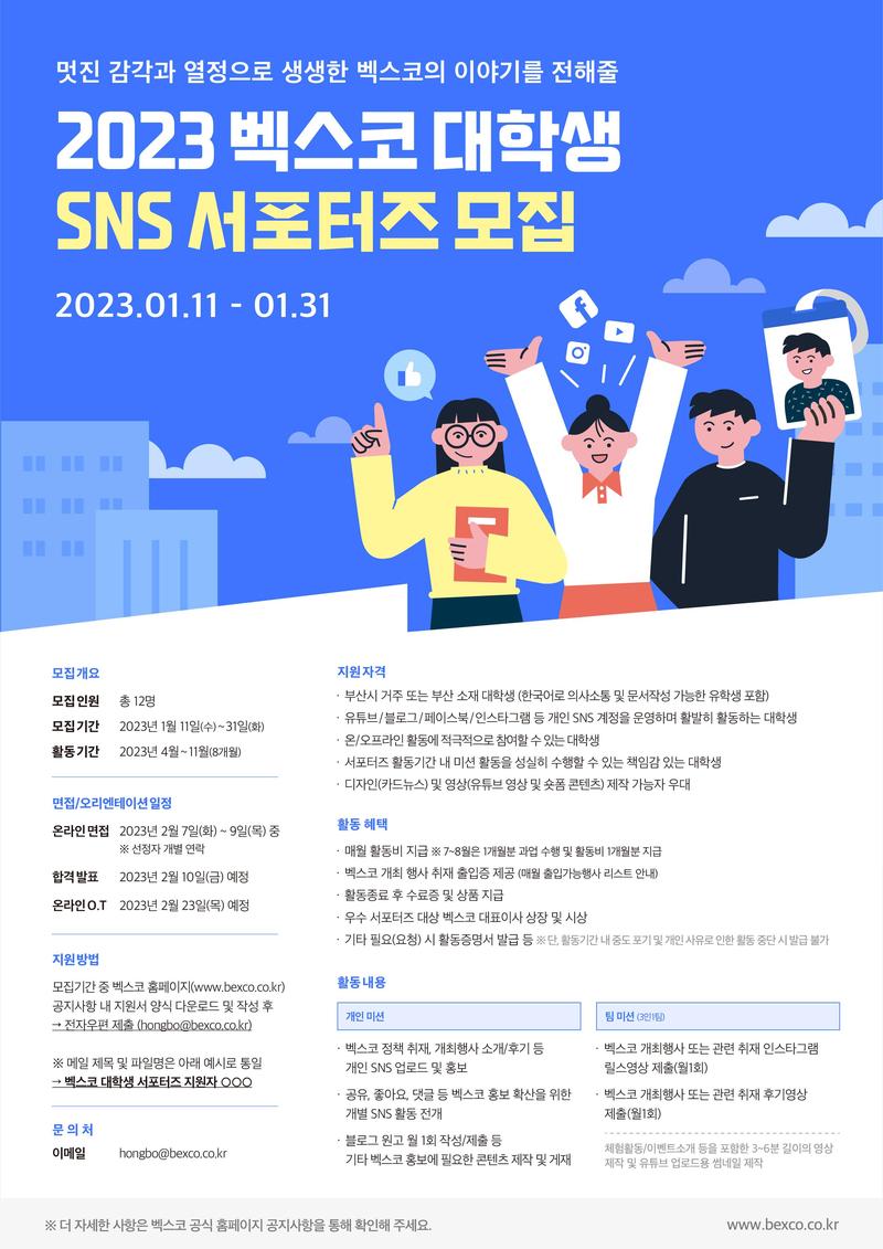 지원자격 ○ 부산시 거주 또는 부산 소재 대학생 (한국어로 의사소통 및 문서작성 가능한 유학생 포함) ○ 유튜브, 블로그, 페이스북, 인스타그램 등 개인 SNS 계정을 운영하며 활발히 활동하는 대학생(이벤트참가용 아이디 사용불가) ○ 온·오프라인 활동에 적극적으로 참여할 수 있는 대학생 ○ 서포터즈 활동기간 내 미션 활동을 성실히 수행할 수 있는 책임감 있는 대학생 ○ 디자인(카드뉴스) 및 영상(유튜브 영상 및 숏폼 콘텐츠) 제작 가능자 우대 활동 혜택 ○ 매월 활동비(10만원/월) 지급 ※ 7\~8월은 1개월분 과업 수행 및 활동비 1개월분 지급 ○ 벡스코 개최 행사 취재 출입증 제공 (매월 출입가능행사 리스트 제공) ○ 활동종료 후 수료증 및 상품 지급 ○ 활동종료 후 우수 서포터즈 대상 벡스코 대표이사 상장 및 시상 ○ 기타 필요(요청) 시 활동증명서 발급 등 ※ 단, 활동기간 내 중도 포기 및 개인 사유로 인한 활동 중단 시 발급 불가 지원 방법 ○ 모집기간 중 벡스코 홈페이지(www.bexco.co.kr) 공지사항 내 지원서 양식 다운로드, 작성 후 전자우편 제출 (hongbo@bexco.co.kr) ※ 메일 제목 및 파일명은 ‘벡스코 대학생 서포터즈 지원자 ○○○’ 으로 통일 면접/오리엔테이션 일정 ○ 화상면접 : 2023년 2월 7일(화) \~ 2월 9일(목) 중 진행 (선정자 개별 연락) ○ 합격발표 : 2023년 2월 10일(금) 예정 ○ 화상오리엔테이션 : 2023년 2월 23일(목) 예정 문의처 ○ 이메일 : hongbo@bexco.co.kr ○ 담당자 : 벡스코 홍보실 안보경 과장 (051-740-7374)