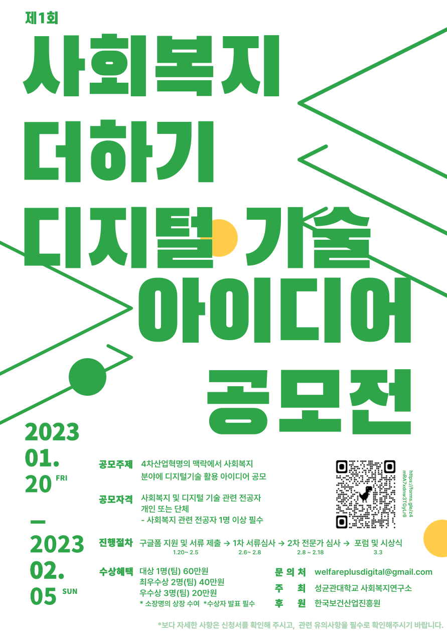 <사회복지 더하기 디지털기술 아이디어 공모전> 2023년도 전반기 사회복지 더하기 디지털 아이디어 공모전을 아래와 같이 안내합니다. **안내사항 필독 문의: welfareplusdigital@gmail.com 신청: https://forms.gle/N1RoT4SFZxfqA4Ga9 [공모주제] 4차산업혁명의 맥락에서 사회복지 분야에 디지털기술 활용 아이디어 공모 [지원자격] 사회복지 및 디지털 기술 관련 전공자 재학, 휴학, 졸업자 모두 지원 가능 - 사회복지 관련 전공자 1명 이상 필수 *사회복지 관련 전공이란 전공명에 ‘복지’가 포함되는 전공을 말함 (예, 아동복지, 교육복지 등) [공모형식 및 분량] 1. 참가신청서 1부. 2. 개인정보 수집 및 이용 동의서(*팀으로 참여하는 경우 모든 참가자 서명 필수) 1부. 3. 아이디어 제안서 2매 이내 1부. - 위의 파일 3부를 압축하여 한 폴더로 업로드 *[주의] 팀으로 지원한 경우라도, 같은 파일을 팀원 모두가 각자 개별 구글폼을 제출해야 함 ** 폴더명은 단체명으로 기재 (개인참여자는 개인 성명 기재) *** 파일명 서식: 원래 파일 이름_(개인참여자는 개인 이름, 단체 참여자는 팀이름) 예, 1.참가신청서 양식_(홍길동) [운영일정] - 지원서 및 서류 제출: 2023.01.20.(금)- 02.05.(일) 23:59 까지 - 1차 서류 심사: 공모전 참여자 자격 기준 충족 여부와 공모전 양식준수 여부 판단 2차 전문가 심사: 서류 심사 통과된 건에 한하여 3명의 외부 전문가가 제출물 심사 수상자 별도 안내(2월 20일(월) 예정) 공모전 시상식 및 포럼: 3월 3일(금) (사회복지, 디지털 관심있는 누구나 참여가능) [심사계획] 1) 1차 서류 심사: 서면평가(02.06-08) 2) 2차 전문가 심사(02.08-18) 3) 수상 혜택 사회복지연구소 소장 명의 상장 및 상금시상 - 공모전 Showcase 및 포럼에서 공모전 수상작 발표 상금 시상 부분별 상의 4) 심사기준 사회문제해결의 필요성(25%), 기술적용의 가능성(25%), 방법론적 적합성(25%), 연구의 참신성 및 기대효과(25%) [시상]