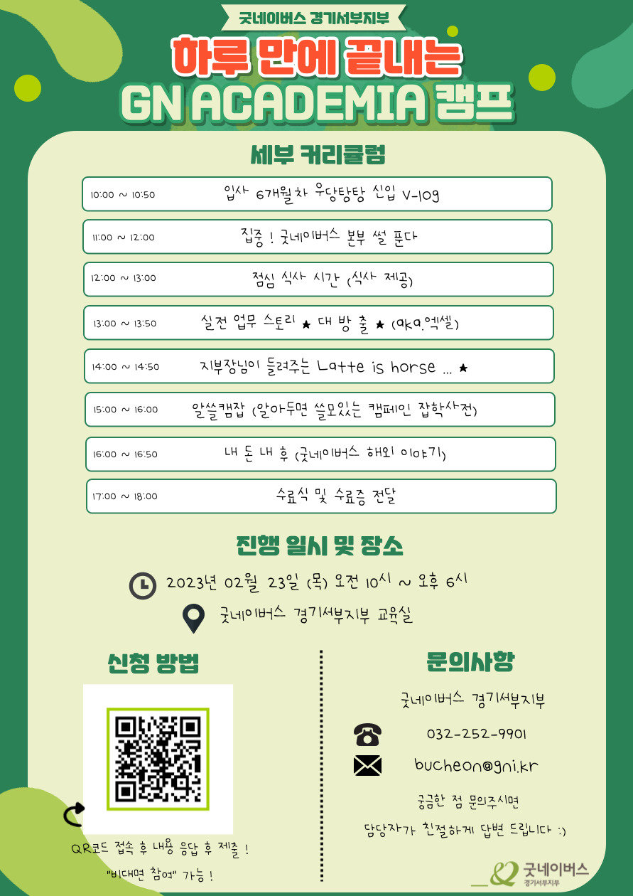 개강 이전 단기속성으로 참여 가능한 GN Academia 캠프 활동 안내드립니다 ! 저희 지부에서는 여러분들에게 직원들의 입사 후 업무를 하며 겪은 여러 다양한 경험들을 GN Academia를 통해 생생하게 전해드리고자 합니다 !
