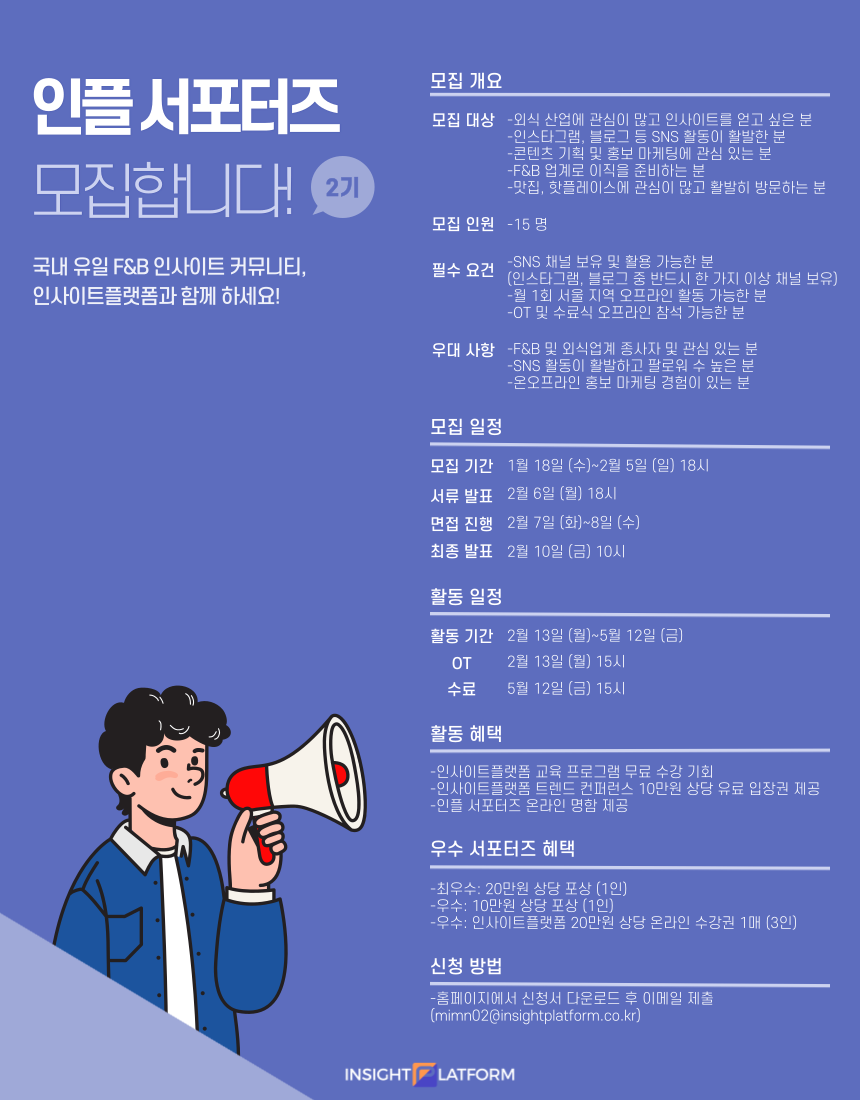 ■ 모집 대상 - 외식 산업에 관심이 많고 인사이트를 얻고 싶은 분 - 블로그\, 인스타그램\, 페이스북\, 유튜브 등 SNS 활동이 활발한 분 - 콘텐츠 기획 및 홍보 마케팅에 관심 있는 분 - F&B 업계로 이직을 준비하는 분 - 맛집\, 핫플레이스에 관심이 많고 활발히 방문하는 분 - 서포터즈 및 대외활동 경험이 있는 분