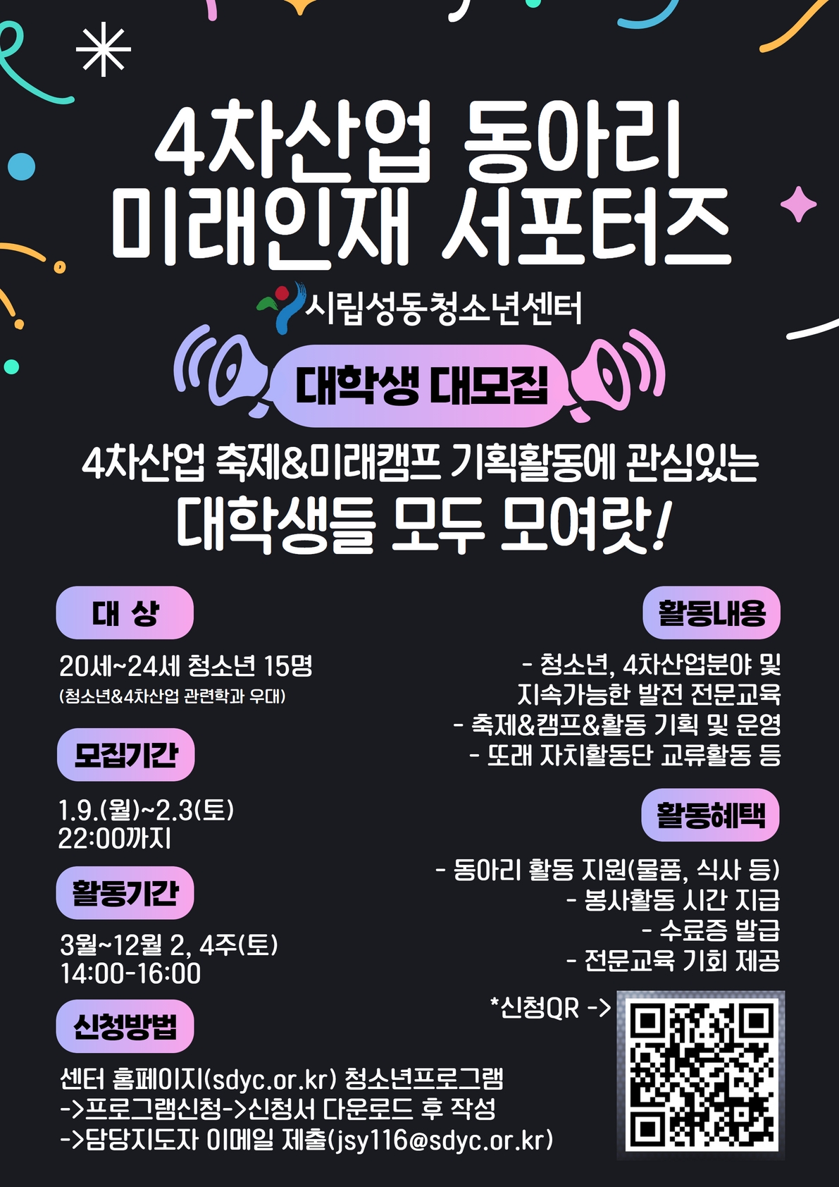 - 대상: 20세\~24세 청소년 15명(4차산업 및 청소년 관련 학과 우대)