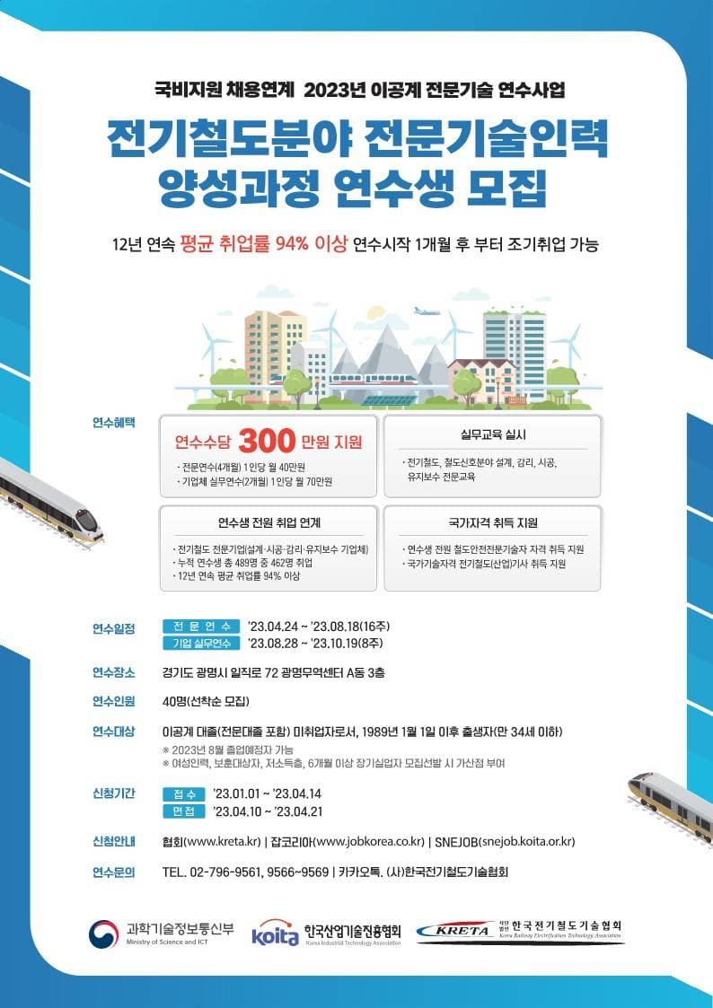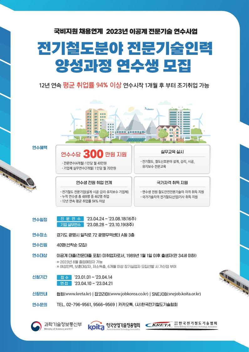 ※ 연수시작 1개월 후 조기취업 가능 4. 연수생 선발 기준 ∘ 이공계 대졸(전문대졸 포함) 미취업자로서, 1989년 1월1일 이후 출생자(만34세 이하) ※ 23년 8월 졸업예정자 포함 ※ 여성인력, 보훈대상자, 저소득층, 6개월 이상 장기실업자 모집선발 시 가산점 부여 ※ 졸업예정자의 경우 지원자 모교 학칙에 의거한 서류(졸업예정증명서외 기타서류) 5. 연수생 선발 제한 기준 ∘ 현재 회사에 재직 중이거나, 회사명의 4대보험(국민연금,건강보험,산재보험,고용보험)에 가입 되어 있는 자 또는 본인명의 사업자등록증이 있는 자(정규직, 비정규직, 일용직 포함) ∘ 정부 실업대책 지원금 수혜 중인 자, 정부부처 실업대책 사업에 참여중인 자, 실업급여 (구직수당, 재취업활동지원금 등) 수급 중인 자 ※ 수혜자 예시: 고용노동부 실업급여, 재직자 훈련, 취업성공패키지, 청년취업아카데미 등 ∘ 동 사업의 기참여자(수혜자) 또는 동 사업에 참여하여 연수수당 1회 이상 지급받은 자 (중도포기자 포함) ∘ 대학교(원) 재학 중인 자 6. 모집인원 ∘ 40명(면접을 통한 선발) 7. 지원내용 ∘ 연수수당 지원: 300만원(*전액 국비지원) - 전문연수(4개월) 월 40만원\, 기업체 실무연수(2개월) 월 70만원 ∘ 전원 취업 연계: 전기철도 전문기업(설계·시공·감리·유지보수 기업체) ∘ 국가자격 취득 지원: 국가전문자격 취득(전기철도분야 철도안전전문기술자), 국가기술자격(전기철도(산업)기사) 취득 지원 8. 교육내용