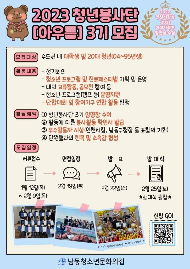 안녕하세요. 남동청소년문화의집입니다^^ 2023년 문화의집 소속 청년(대학생)봉사단 3기를 모집합니다! 청소년과 함께하는 다양한 봉사활동과 대외 활동으로 2년 연속 봉사활동부문 장관상 및 시장상 등을 수상한 남청문 [아우름]과 함께 보람찬 1년을 보내실 분들을 기다립니다! 봉사활동, 구청장 및 시장 표창의 기회 등 알차고 즐거운 학교 외 생활을 만들어가실 대학생 및 청년 여러분의 많은 관심과 신청 부탁드립니다 ★ 기타 자세한 활동 내용이 궁금한 분들은 홈페이지 갤러리 및 인스타그램을 통해 아우름 1\~2기 활동 모습을 구경하세요_★( 인스타그램 @namdong.youth.center ) 감사합니다.