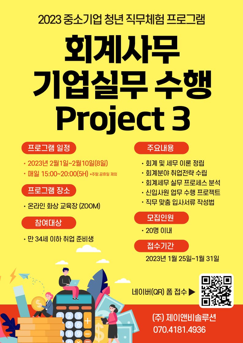 ∨ 1. 회계/세무 이론편 - 직무이론 기초이해 - 직무 프로세스 이해 - 기업 규모별 취업준비 전략 ∨ 2. 회계/세무 프로젝트 수행편 - 회계세무 자기주도 실습 진행 - 회계 현직 전문가의 피드백 - 실무자 멘토링 & 미션 수행 ∨ 3. 회계/세무 취업준비편 - 취업준비 가이드 - 직무 맞춤 이력서, 자소서 작성법 - 스토리, 강점 키워드 도출 👉 만족도 97점, 3기로 다시 찾아온 프로젝트! 👉 프로젝트 수행 중심으로 신입사원 실무 완벽 이해 👉 기업 현직 실무자의 업무수행 시크릿 대공개