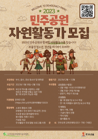 1. 모집 개요 1) 대상 : 부산, 경남, 울산 지역의 청소년, 대학생 약 20여명 2) 모집 기간 : 2023.1.18.(화)\~ 2023.2.15.(수) 24:00 3) 활동 기간 : 2023. 2. \~ 12. 4) 활동 장소 : 부산전역 5) 방법 : https://bit.ly/민주공원자원활동가2023 6) 주최 : (사)부산민주항쟁기념사업회 7) 주관 : 민주공원 8) 문의 : 교육문화팀 051-790-7480, www.demopark.or.kr