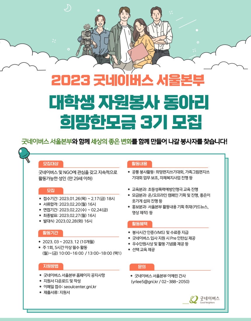 ★ 굿네이버스 서울본부에서 2023년 대학생자원봉사동아리 '희망한모금 3기'를 모집합니다! ★ ★많은 관심과 지원 바랍니다!★