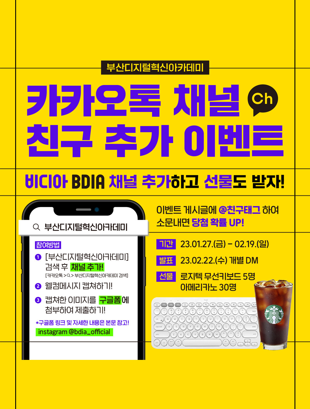 💚 참여방법 1️⃣ [부산디지털혁신아카데미] 검색 후 채널 추가! → https://pf.kakao.com/_uxcsixj 2️⃣ 웰컴메시지 캡쳐하기! 3️⃣ 캡쳐한 이미지를 #구글폼에 첨부하여 제출하기! 🌟이벤트 게시글에 @친구태그 하여 소문내면 당첨 확률 UPUP !!