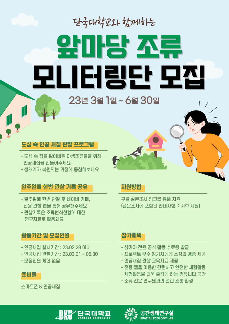 - 단국대학교 공간생태연구실에서 진행하는 인공새집 관찰 프로젝트 <앞마당 조류 모니터링단>은 도심 속 번식 공간이 부족한 박새, 곤줄박이와 같은 소형 조류들을 대상으로 둥지를 지을 수 있는 공간(인공새집)을 제공해 주는 생물 다양성 증진 프로젝트입니다.