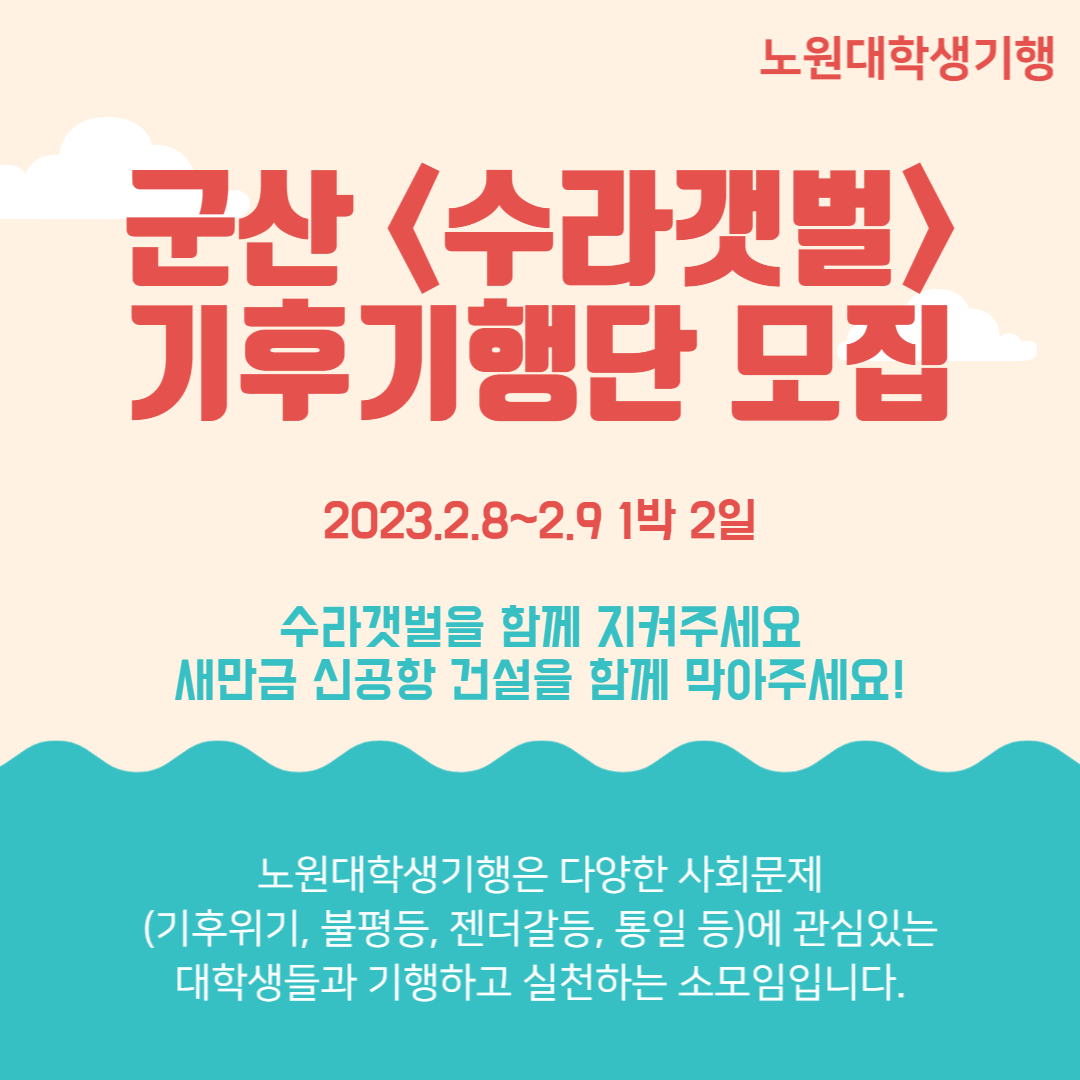 기행 프로그램 -일시: 2023/2/8 \~ 2/9 1박 2일 -군산 수라갯벌과 미군기지 탐방 -강연 '군산 시민단체들이 새만금신공항을 반대하고 나선 이유?' -신나는 뒤풀이