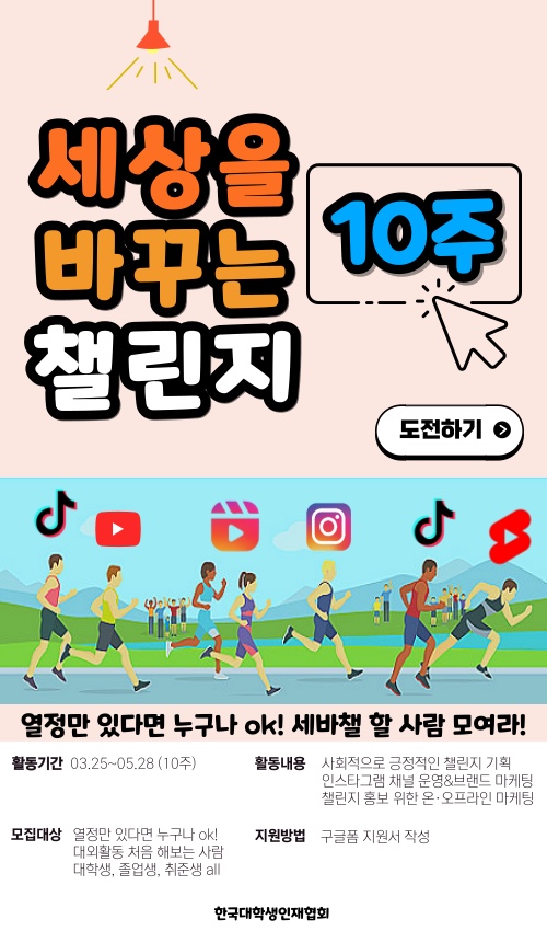 ▶ 제목 : 세바챌, 세상을 바꾸는 챌린지! ▶ 주최사 / 활동명 : 한국대학생인재협회 / 챌린지 기획단