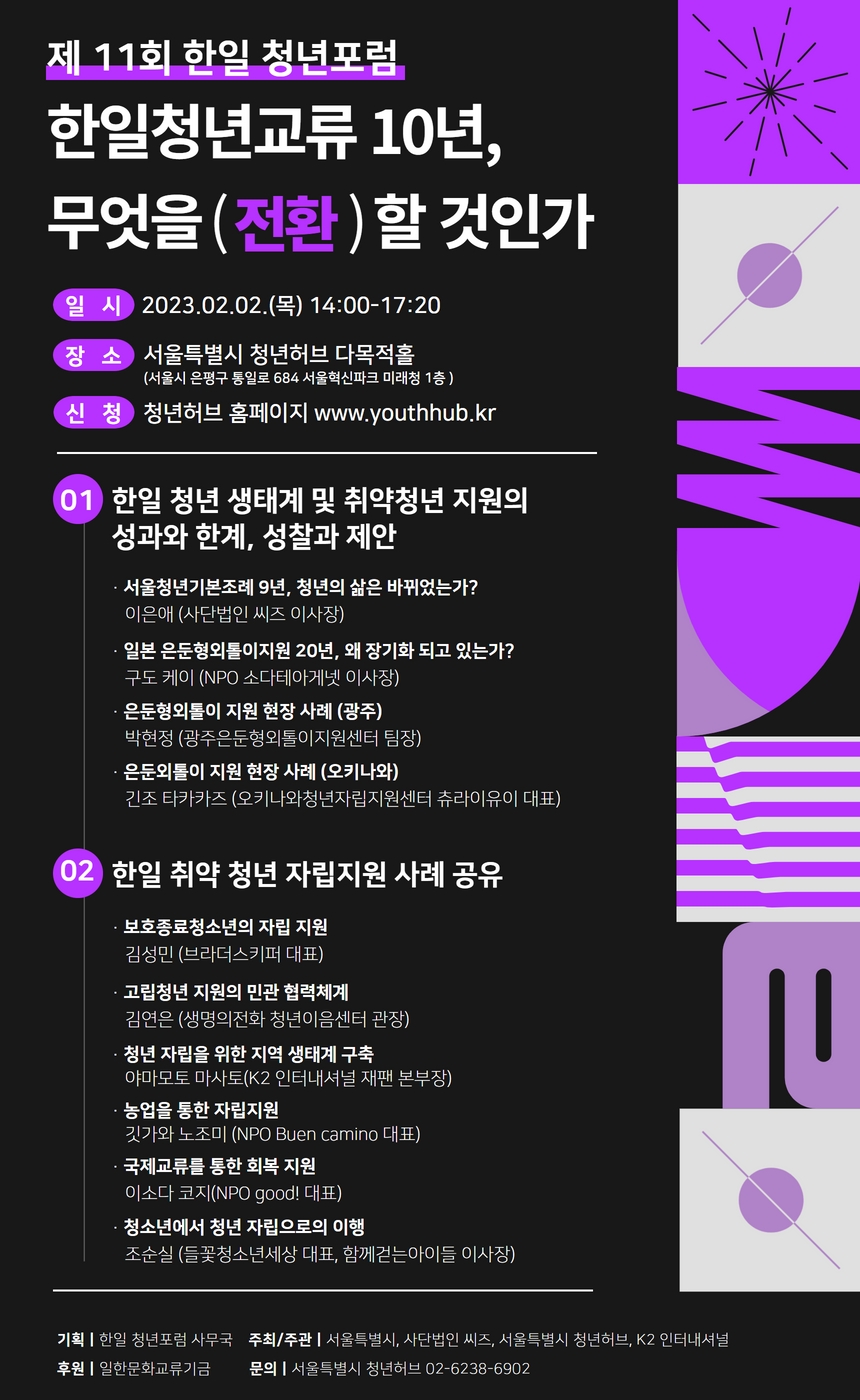 ✅ 일시: 2023.02.02.(목) 14:00-17:20 ✅ 장소: 서울특별시 청년허브(서울시 은평구 통일로 684 서울혁신파크 미래청 1층) ✅ 포럼 내용: 01. 한일 청년 생태계 및 취약청년 지원의 성과와 한계\, 성찰과 제안 – 서울청년기본조례 9년, 청년의 삶은 바뀌었는가? / 이은애(사단법인 씨즈 이사장) – 일본 은둔형외톨이 지원 20년, 왜 장기화 되고 있는가? / 구도 케이(NPO 소다테아게넷 이사장) – 한일 은둔형외톨이 지원 현장 사례(광주) / 박현정(광주 은둔형외톨이지원센터 팀장) – 한일 은둔형외톨이 지원 현장 사례(오키나와) / 긴조 타카카즈(오키나와 청년자립지원센터 츄라이유이 대표) 02. 한일 취약 청년 자립지원 사례 공유 – 보호종료청소년의 자립 지원 / 김성민(브라더스키퍼 대표) – 고립청년 지원의 민관 협력체계 / 김연은(생명의전화 청년이음센터 관장) – 청년 자립을 위한 지역 생태계 수축 / 야마모토 마사토(K2인터내셔널 재팬 본부장) – 농업을 통한 자립지원 / 깃가와 노조미(NPO Buen camino 대표) – 국제교류를 통한 회복 지원 / 이소다 코지(NPO good! 대표) – 청소년에서 청년 자립으로의 이행 / 조순실(들꽃청소년세상 대표, 함께걷는아이들 이사장) *온라인 참여 희망자는 아래 문의처로 문의바랍니다. ✅ 기획: 한일청년포럼 사무국 ✅ 주최/주관: 서울특별시, 사단법인 씨즈, 서울특별시 청년허브, K2 인터내셔널 ✅ 후원: 일한문화교류기금 ✅ 문의: 서울특별시 청년허브(02-6238-6916) ✅ 신청: 2023 한일 청년포럼 사전신청 https://bit.ly/3jdstFc