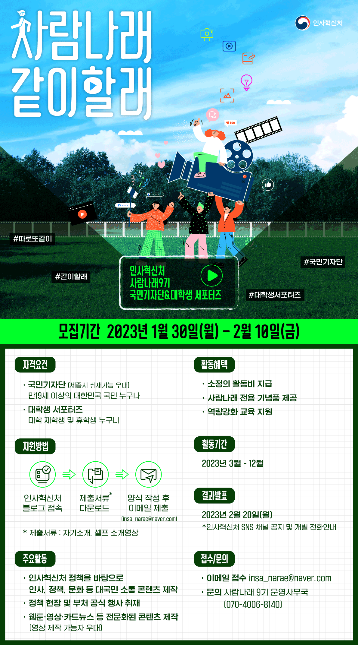 2023년 인사혁신처 사람나래9기 국민기자단&대학생 서포터즈를 모집합니다! 여러분의 뜨거운 열정\~ 인사혁신처와 함께 해 주세요!