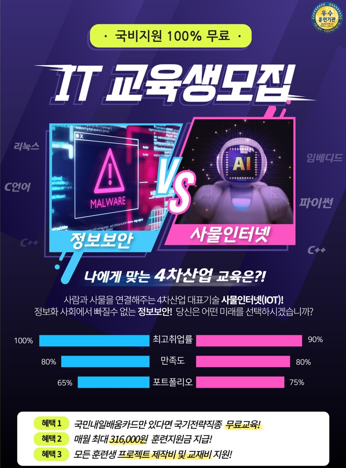 ✔ 전공에 상관없이 보안솔루션 개발자 직군으로 취업하고자 관련분야 다지고 싶은 취준생 ✔ 개발자 직군 입사를 목표로 소프트웨어 개발자, 엔지니어 직군을 희망하는 훈련생 ✔ 데이터 독학으로 공부의 효율이 나지 않는 학생 ✔ 눈에 보이는 프로젝트 결과물을 만들고, 현장전문가 앞에서 시연하고 싶은 분 ✔ 교육을 수료하고 취업맞춤특기병 또는 sw개발병으로 병역대체하고 싶은 분
