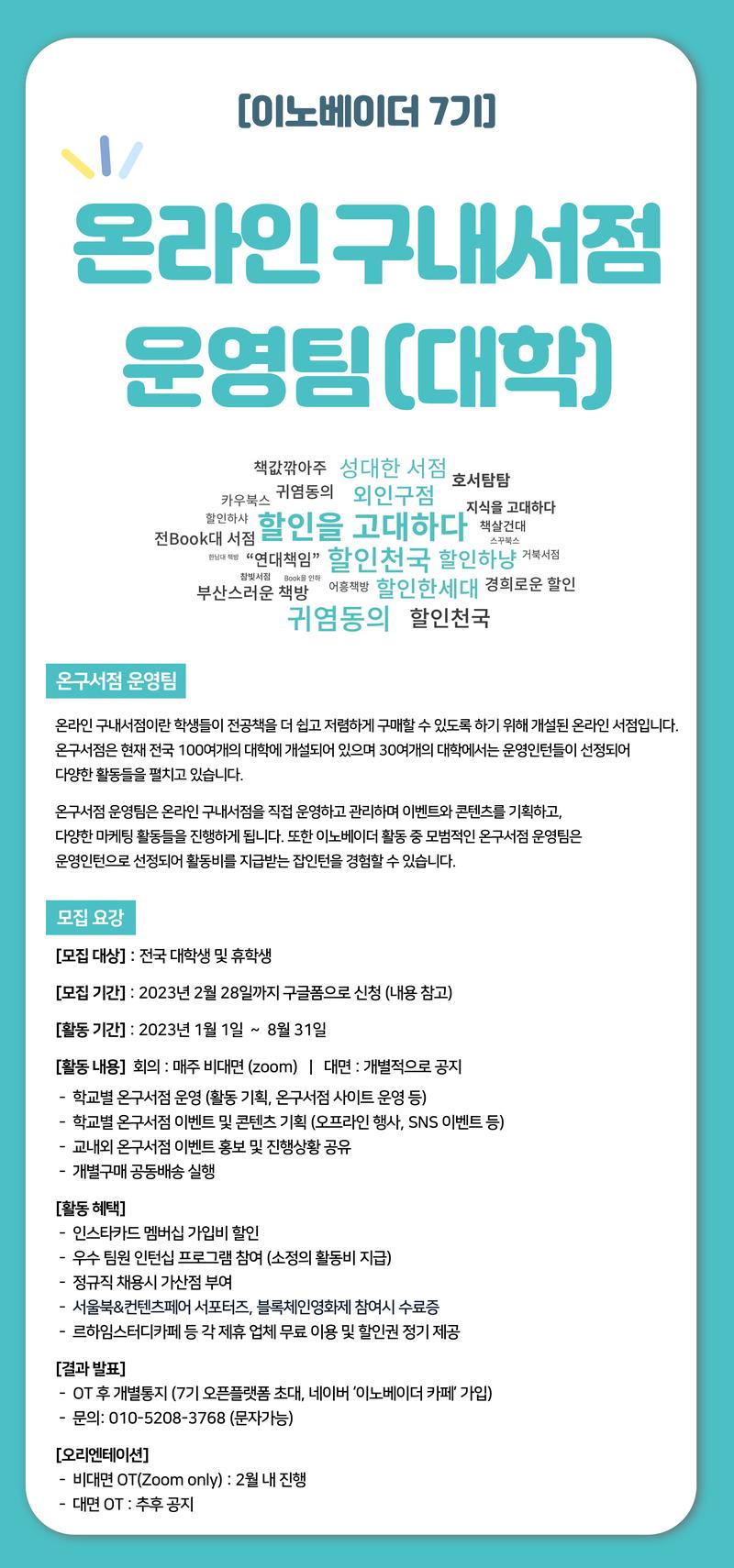 🏫 [온구서점] 온라인 구내서점이란? 온라인 구내서점이란 학생들이 전공책을 조금 더 쉽고 저렴하게 구매할 수 있도록 하기 위해 개설된 온라인 서점입니다. 온구서점은 현재 전국 100여개의 대학에 개설되어 있으며 30여개의 대학에서는 운영인턴들이 선정되어 다양한 활동들을 펼치고 있습니다. 온구서점 운영팀은 각 대학 온라인 구내서점을 직접 운영하고 관리하며 이벤트와 콘텐츠를 기획하고, 관련된 마케팅 활동들을 진행하게 됩니다. 또한 이노베이더 활동 중 모범적인 온구서점 운영팀은 운영인턴으로 선정되어 활동비를 지급받는 잡인턴을 경험할 수 있습니다. 🙋♀️ 온구서점 운영팀(대학) 지원 방법 [지원 링크] : 📩 https://forms.gle/CugwfCXeyuMLHF8y7 (✔️ 온라인 구내서점 운영팀) [접수 기간] : 2023년 2월 28일까지 구글폼으로 신청 [활동 기간] : 2023년 1월 1일 \~ 8월 31일