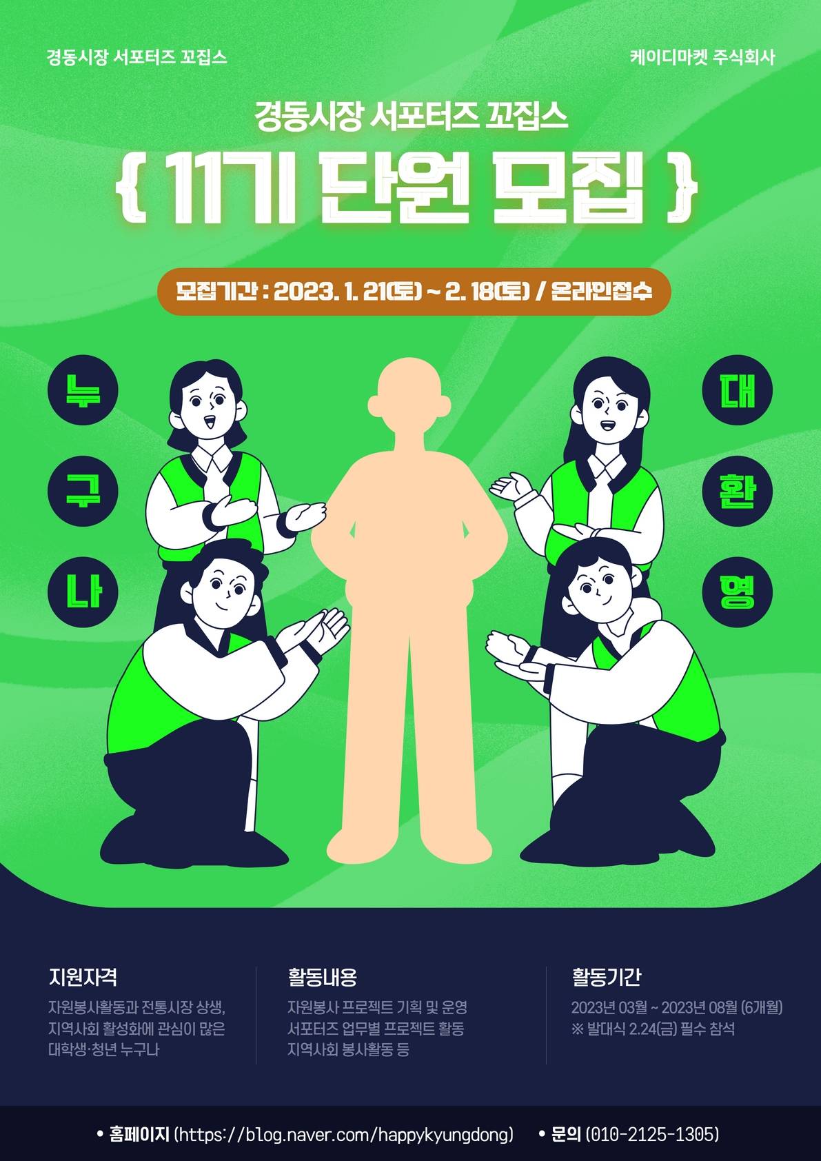 경동시장 서포터즈 꼬집스는 서울특별시 동대문구의 전통시장 경동시장과 지역공동체의 상생 및 활성화를 위해 만들어진 대학생·청년 봉사단이자 서포터즈입니다. # 서울_동대문구_최대규모_전통시장! 역사와 전통의 경동시장을 통해 지역 공동체와 소통할 수 있습니다. # 대학생_청년_서포터즈! 대학생과 청년들이 모여 훌륭한 경험을 쌓을 수 있는 기회를 제공합니다. # A_to_Z_우리가_만든다! 꼬집스에서는 여러분이 머릿속으로만 그리던 모든 봉사 활동을 기획부터 운영까지 실현할 수 있습니다. ————————————————————————————————————————————— 01 활동기간 2023년 03월 \~ 2023년 08월 (6개월) ※ 발대식 2.24(금) 필수 참석 02 활동내용 1) 자원봉사활동 프로젝트 기획 및 운영 2) 서포터즈 업무별(운영, 인사, 프로젝트, 마케팅) 프로젝트 활동 3) 지역사회(공동육아나눔터, 유기견 보호소, 복지관 등) 봉사활동 03 모집대상 자원봉사활동 프로그램 기획 및 운영, 전통시장 상생 및 활성화에 관심이 많은 대학생·청년 누구나 04 활동인원 24명 ※ 6인 1팀으로 구성 예정 (운영팀 6명, 인사팀 6명, 프로젝트팀 6명, 마케팅팀 6명) 05 선발일정 서류 접수 1.21(토)\~2.18(토) 24시 최종 발표 2.19(일) *개별 통보 06 활동특전 1365 봉사시간 지급 서포터즈 공식활동 증서 발급 우수활동자 대상 공공기관 표창장 및 장학금 수여 서포터즈실 물품 및 간식 제공 업무별, 팀별 프로젝트 비용 지원 07 지원방법 경동시장 서포터즈 꼬집스 네이버 블로그(https://blog.naver.com/happykyungdong)에서에서) 지원서 양식 다운 후 이메일 제출 ※ 이메일 happykyungdong@naver.com 08 문의사항 경동시장 서포터즈 꼬집스 010-2125-1305 09 유의사항 최종 합격 후 2월 24일(금) 오프라인 발대식 필참입니다. 코로나19 상황에 따라 온라인, 오프라인 활동이 병행될 수 있습니다. 활동 시작 후 업무부서(운영, 인사, 프로젝트, 마케팅)가 결정됩니다.
