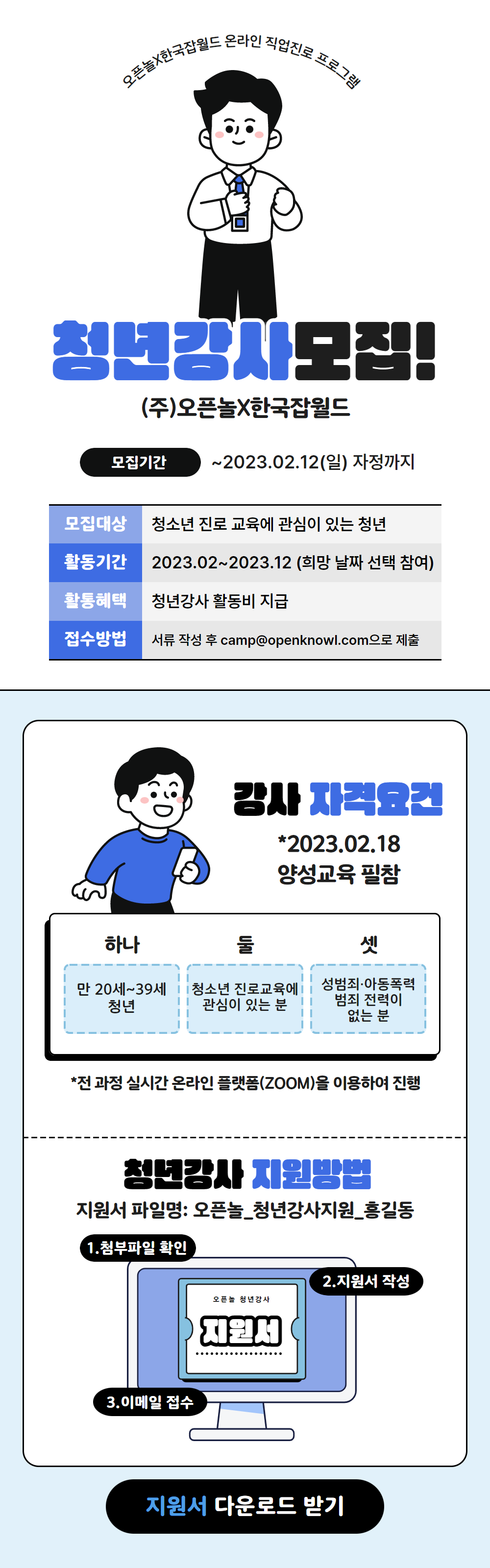 2. 작성한 지원서는 오픈놀_청년강사지원서_홍길동 양식에 맞추어 camp@openknowl.com으로 제출해주세요.