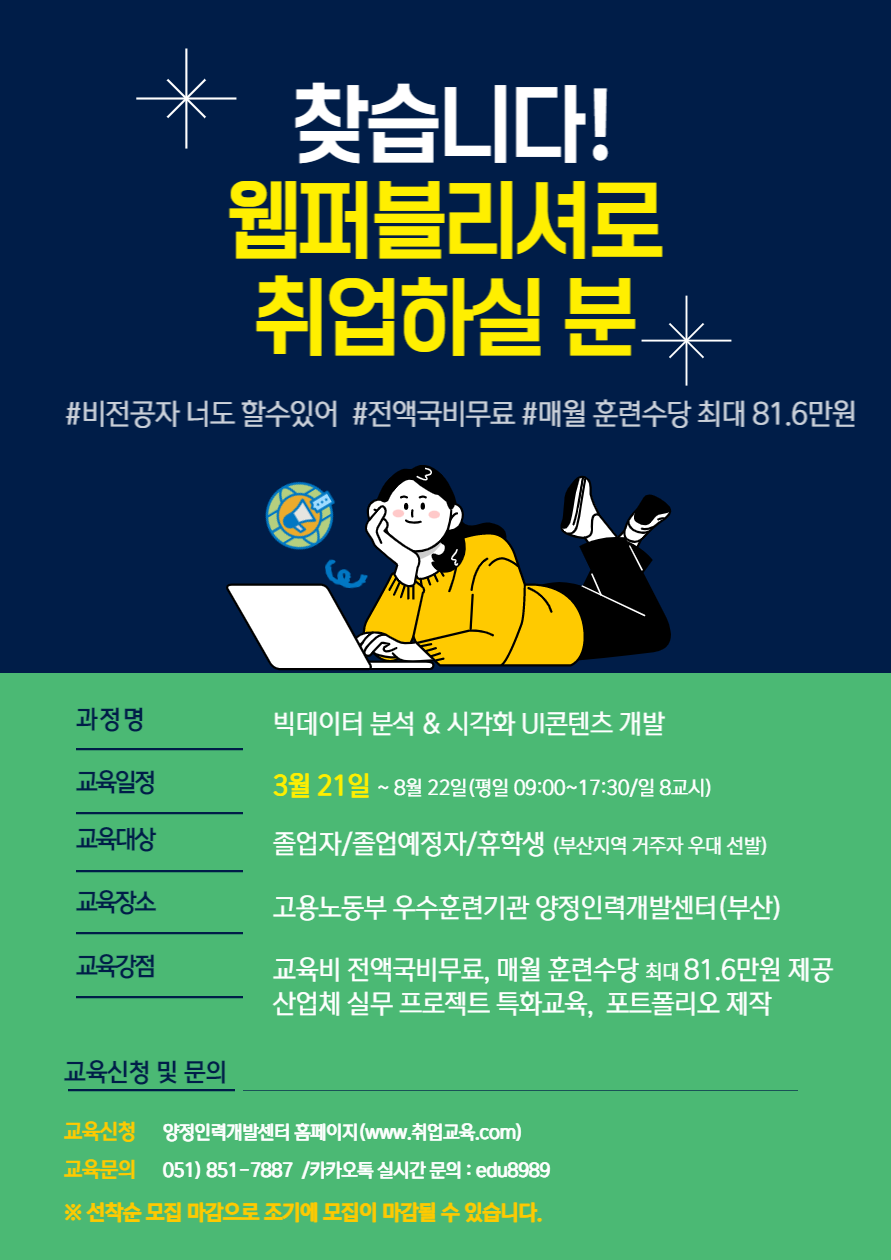 6) 웹에 활용되는 빅데이터 분석 기술에 대해서 알고 싶은분 V 웹퍼블리셔는 왜 전문역량이 필요할까?? “웹은 가장 거대한 미술의 전시장이 될 것이다”-존 마에다 “일러스트레이이션은 사고의 존재방식이자 시각 형태를 담은 전달체” -밀턴 글레이저 “바람직한 제품을 디자인한다 함은 곧 총체적인 사용자경험을 디자인하는 것을 뜻한다.”-도널드 노먼 “디자인은 비즈니스이며 동시에 비즈니스 속의 문화이다.”-칸 타이킁 “디자인은 철저한 소비자 연구의 결과물”-정국현 V 신청방법이 어떻게 되나요? 양정인력개발센터 홈페이지(https://www.jobyj.co.kr/)수강신청 → 유선안내 → 센터 방문 및 상담 V 교육에 참여하면 어떤 혜택이 있나요? - 교육비 전액 국비 무료 - 전 교재 무상 제공 - 매월 훈련수당 최대 81.6만원 제공 (국민취업지원제도 연계 시) - 취업용 포트폴리오 제작지원 - 1대 1 맞춤 취업지원서비스 제공 V 교육일정과 교육장소가 궁금해요! - 교육기간 : 3월 22일\~8월 21일(평일 09:00\~17:30, 일 8교시) - 교육장소 : 양정인력개발센터(부산) V 교육프로그램은 무엇이 있나요? - 프로그래밍 기초 - UIUX디자인(포토샵&일러스트) - 화면구현 및 설계 - 퍼블리싱(UI구현, 웹페이지 구현) - 빅데이터 분석 및 처리(R) - 프로젝트 제작 V 교육과정에 대한 자세한 내용이 궁금하다면? * 양정인력개발센터 홈페이지 : https://www.jobyj.co.kr/ * 유선문의 051) 851-7887 * 카카오톡 실시간 문의 : edu8989