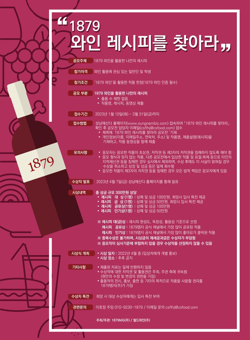 ‘1879 와인 레시피를 찾아라’ 공모전 ■ 공모주제 : 1879 와인을 활용한 나만의 레시피 ■ 참가자격 : 와인 활용에 관심 있는 일반인 및 학생 ■ 참가조건 : ‘1879 와인’을 활용한 작품 한정(1879 와인 인증 필수) ■ 공모 부분 : 1879 와인을 활용한 나만의 레시피 - 출품 수 제한 없음 - 작품명\, 레시피\, 동영상 제출 ■ 접수기간 : 2023년 1월 10일(화) \~ 3월 31일(금)까지 ■ 접수방법 : 성남에산다 홈페이지(www.sungnambiz.com) 접속하여 「1879 와인 레시피를 찾아라」 확인 후 담당자 이메일(csflhj@csfood.com) 접수 - 제목에 ‘1879 와인 레시피를 찾아라 공모전’ 기재 - 개인정보(이름\, 이메일주소\, 연락처\, 주소) 및 작품명\, 작품 설명(레시피)을 기재하고\, 작품 동영상을 함께 제출 ■ 응모 시 유의사항 - 응모자는 응모한 작품이 초상권\, 저작권 등 제3자의 저작권을 침해하지 않도록 해야 함 - 응모 형식과 맞지 않는 작품\, 다른 공모전에서 입상한 작품 및 표절․복제 등으로 타인의 지적재산권 등을 침해한 경우 심사에서 제외하며\, 수상 후에도 이 사실이 밝혀질 경우 수상을 취소하고 상장 및 상금 등은 일체 회수함 - 응모한 작품이 제3자의 저작권 등을 침해한 경우 모든 법적 책임은 응모자에게 있음 ■ 수상작 발표 : 2023년 4월 7일(금) 성남에산다 홈페이지를 통해 발표 ■ 시상내역 총 상금 규모 300만원 상당 레시피 대상(1명) : 상패 및 상금 100만원, 희망시 입사 특전 제공 레시피 금상(1명) : 상패 및 상금 50만원, 희망 시 입사 특전 제공 레시피 공유상(1명) : 상패 및 상금 100만원 레시피 인기상(1명) : 상패 및 상금 50만 ※ 레시피 대(금)상 : 레시피 완성도, 독창성, 활용성 기준으로 선정 레시피 공유상 : 1879엠지 공식 채널에서 가장 많이 공유된 작품 레시피 인기상 : 1879엠지 공식 채널에서 가장 많이 좋아요가 클릭된 작품 ※ 중복수상은 불가하며, 시상금의 제세공과금은 수상자가 부담함 ※ 응모작이 심사기준에 부합하지 않을 경우 수상작을 선정하지 않을 수 있음 ■ 시상식 개최 - 시상 일자 : 2022년 4월 중 (입상자에게 개별 통보) - 시상 장소 : 추후 공지 ■ 기타사항 - 제출된 자료는 일체 반환하지 않음 - 수상작에 대한 저작권 및 활용권은 주최\, 주관 측에 귀속됨(원안의 수정 및 변경의 권한을 가짐) - 출품작의 전시\, 홍보\, 출판 등 기타의 목적으로 작품을 사용할 권리를 1879MG(주)가 가짐 ■ 수상자 특전 : 희망 시 대상 수상자에게는 입사 특전 부여 ■ 관련문의 - 이호정 주임 010-9230-1879 /메일 csflhj@csfood.com 주최/주관: 1879MG(주) 후원/협찬: 1879(주), 강남와인스쿨(주), 부산와인스쿨(주), 월드와인(주)