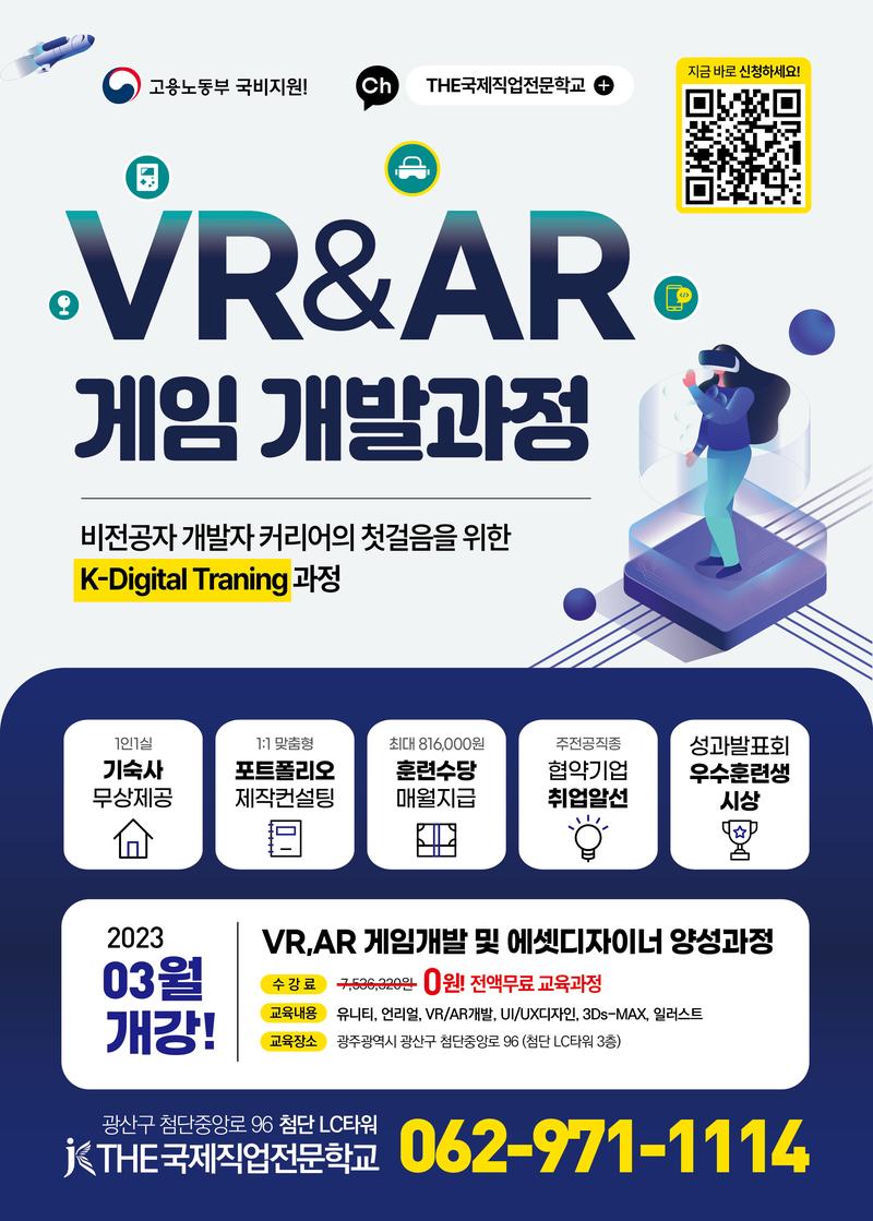 본 과정은 고용노동부가 주관하는 4차산업혁명 선도인력 양성훈련사업으로 선정된 과정으로 4차 산업혁명 시대적 요구에 따른 인재를 양성하기 위한 과정입니다. AR·VR 콘텐츠를 기획하고 유니티 엔진과 3D-MAX, Z-Brush, substance 등의 프로그램을 학습하여 다양한 가상현실 콘텐츠를 개발할 수 있는 스킬을 배웁니다.