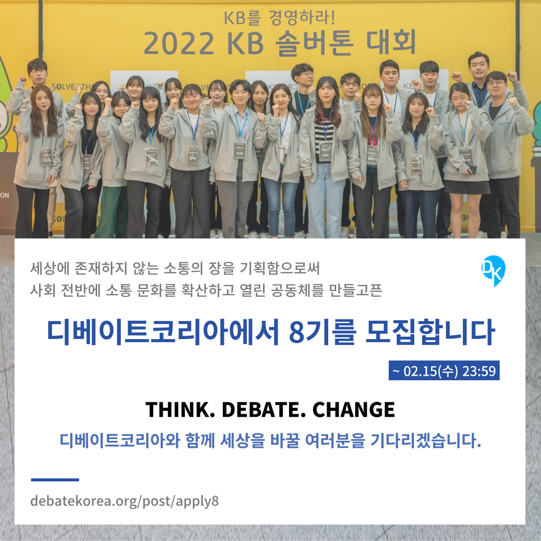 💡 새롭고 창의적인 목소리를 담아내고 사회에 전달해 변화를 만들어내는 소통의 장, 솔버톤 대회 디베이트코리아는 2022년 KB금융그룹과 함께 국내 최초로 솔버톤 대회를 기획 및 운영하며 새로운 소통의 장을 만들었습니다. 이제 더 큰 규모의, 기존과는 다른 재미를 가진 소통의 장을 기획하고 운영할 디베이트코리아 8기를 모집합니다.