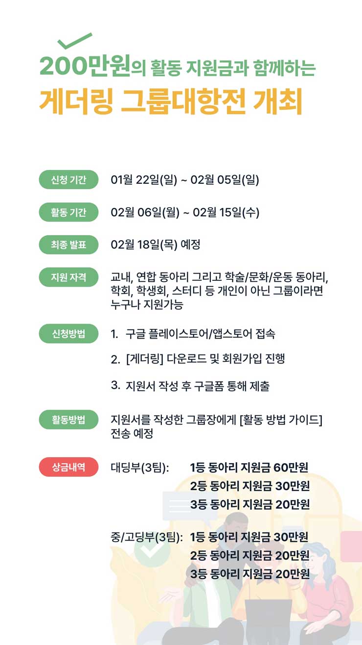* 수집된 정보는 제 1회 게더링 그룹 대항전 평가와 지원금 지급을 위해서만 사용됩니다.