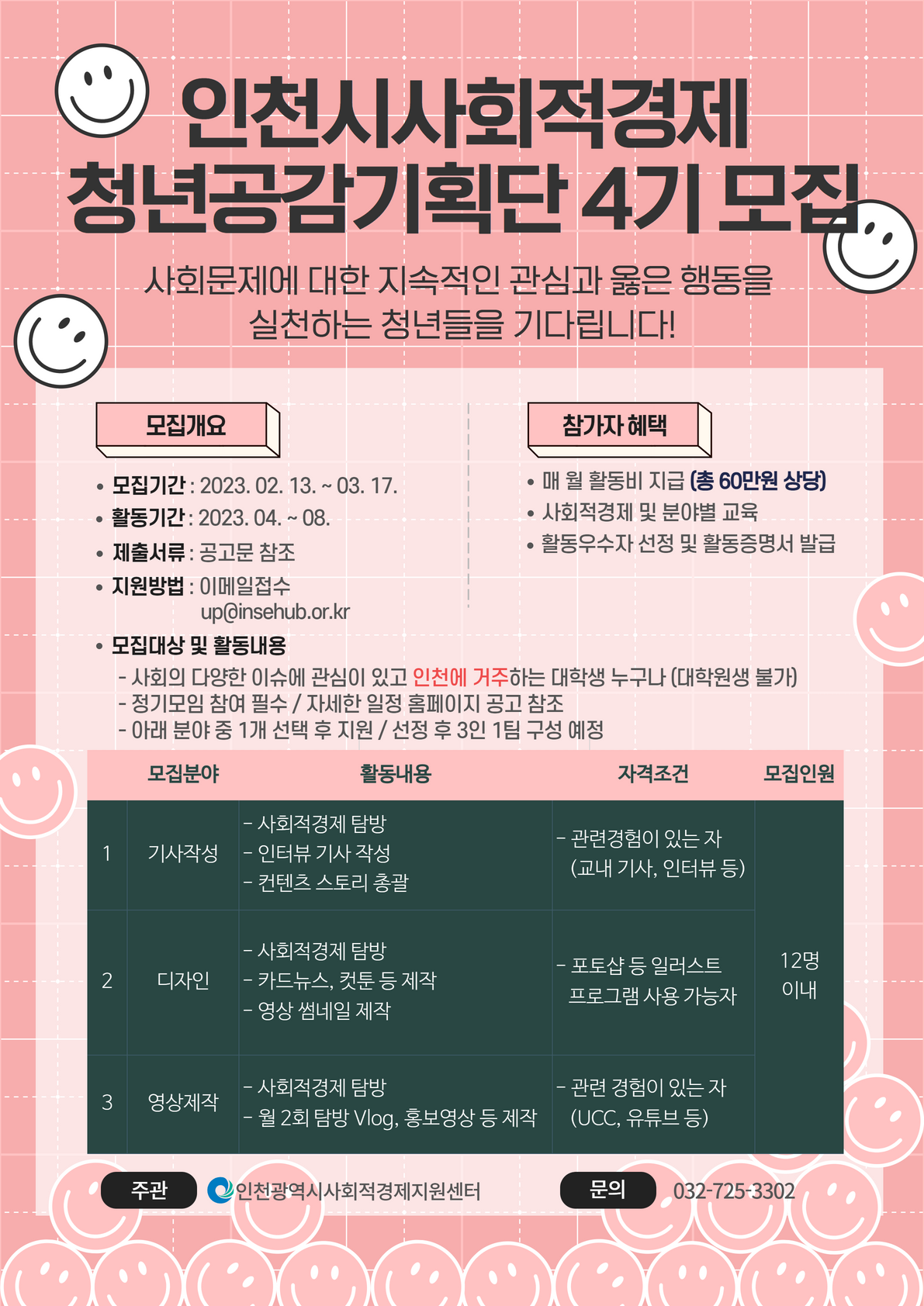 인천광역시 사회적경제지원센터 사회적경제 청년 공감기획단 4기 모집 공고 인천광역시 사회적경제지원센터는 사회적경제의 지속적인 성장을 위한 차세대 리더 육성을 위해 적극적이고 창의적인 청년들을 모시고자 아래와 같이 공고하오니 많은 관심과 지원 바랍니다. 2023년 3월 인천광역시 사회적경제지원센터