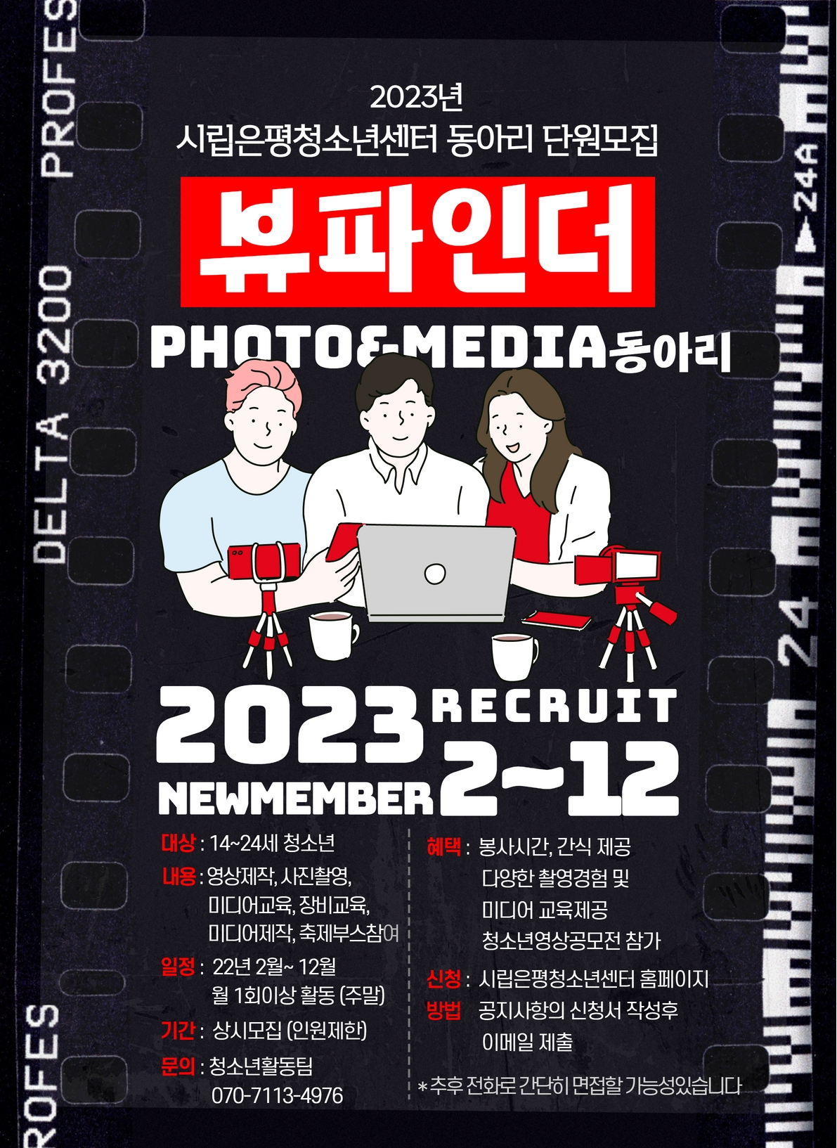 '뷰파인더'는 시립은평청소년센터 소속 동아리로 사진과 미디어를 활용하여 사진전, 미디어 활용 교육, 영상제작활동, 공모전 출품 등 다양한 활동을 할 수 있습니다!
