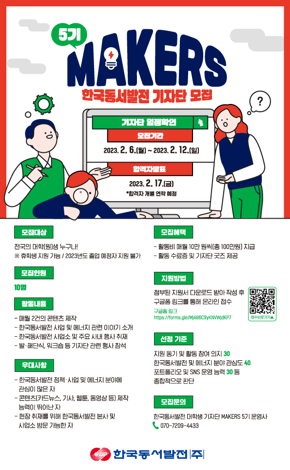 □ 문의 : 한국동서발전 대학생 기자단 MAKERS 5기 운영사 / ☏ 070-7209-4433